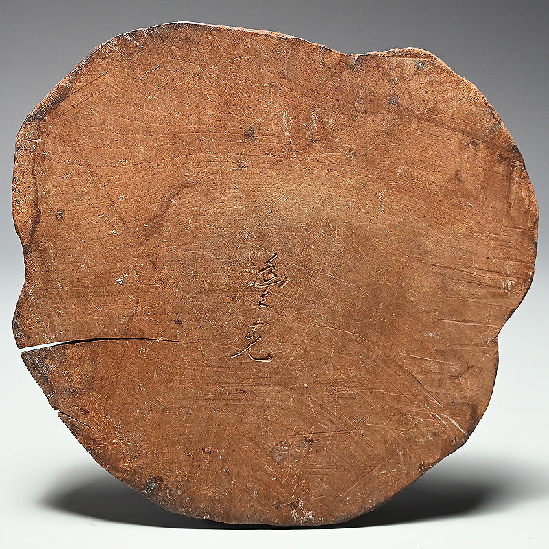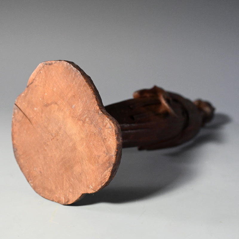 大正時代(1911~1925年)に制作された 扇を持ち月を見つめる大陸美人を描いた一刀彫です。下部に作者の署名が入っています。高さは39.5cmで 全体的には良好な状態ですが、底部に端から伸びる亀裂があります。