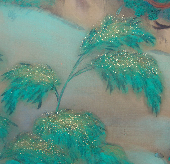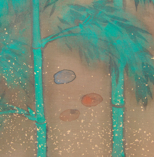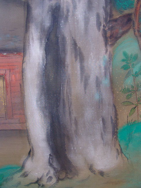 The worn gilded doors o a temple storehouse shimmer softly in the dark quiet of a forest, a fine painting in the Taisho to early-Showa style stamped Roko. One can barely hear the occasional rustling of the cedars, the silence disturbed only by the lone song of a distant bird. It is an intimate scene enveloping the viewer in a very private world. It is likely the work of Sakakibara Roko. It has been completely remounted.