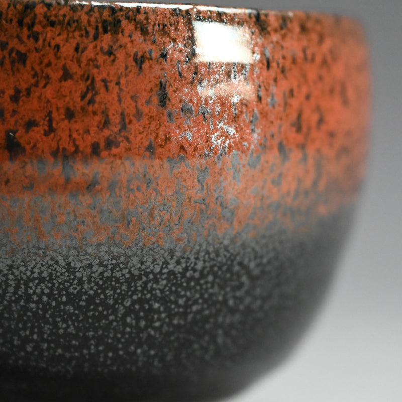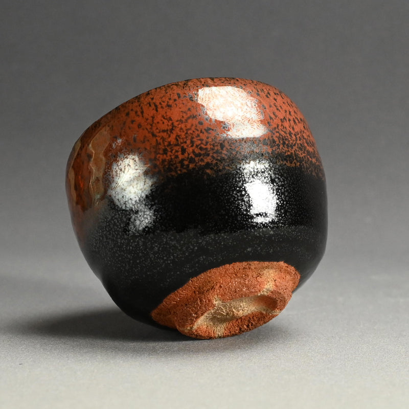 木村守一作の油染茶碗。光沢のあるメタリックブラックから錆びた赤まで、泡立てた緑色の抹茶と見事に調和する色合いです。「天目油茶碗」と題されたオリジナルの銘木箱に収められています。直径12cm、高さ9.5cmで、状態は良好です。