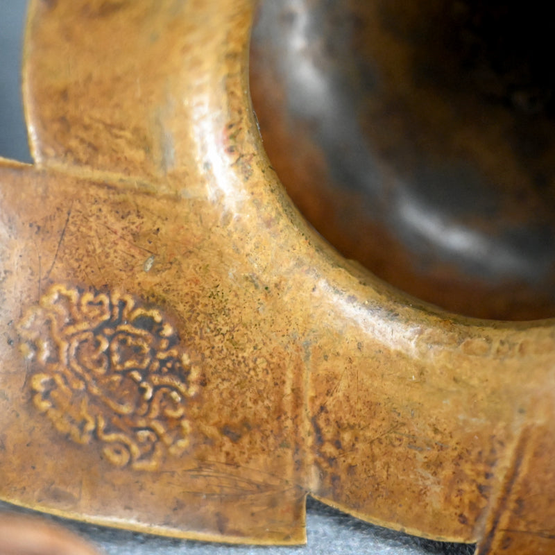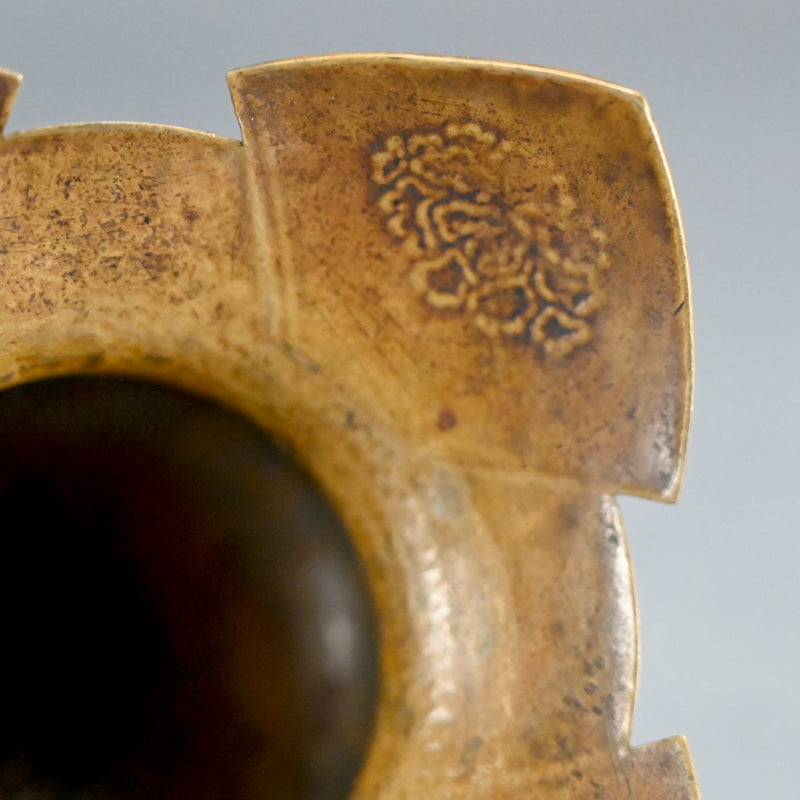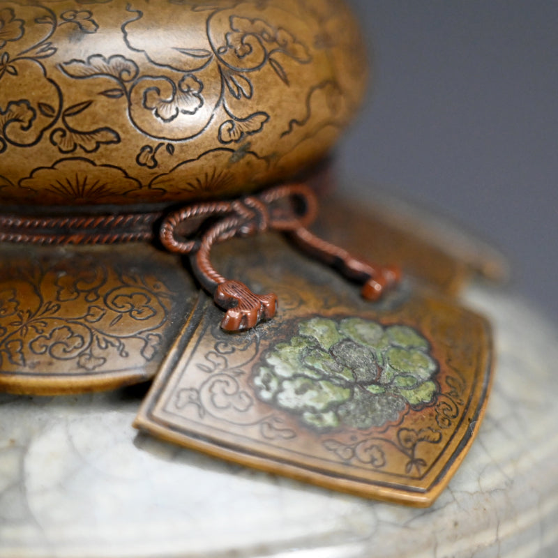 口が小さく 木製の栓がついた美しいひび割れ青磁の壺です。布の蓋の形をした渦巻く蔓と花が彫られた真鍮の蓋がかぶせられており、「高麗 雲鶴青磁振出」と題された美しい桐箱に収められています。肩の周りには 花の形の帯が刻まれており、その下には白い泥が塗られています。同じ技法で ベースと分ける二重線の上に、舞い上がる鳥と円が描かれています。直径10.5cm、高さ15.5cmで 状態は良好です。