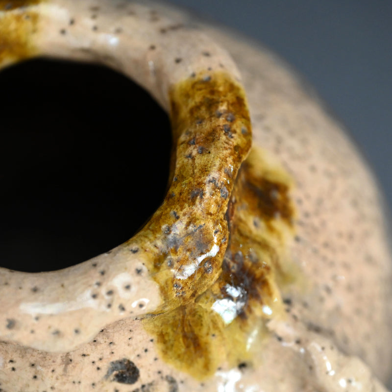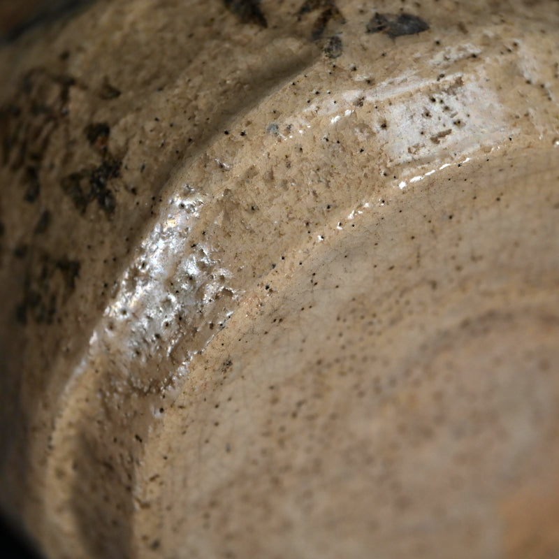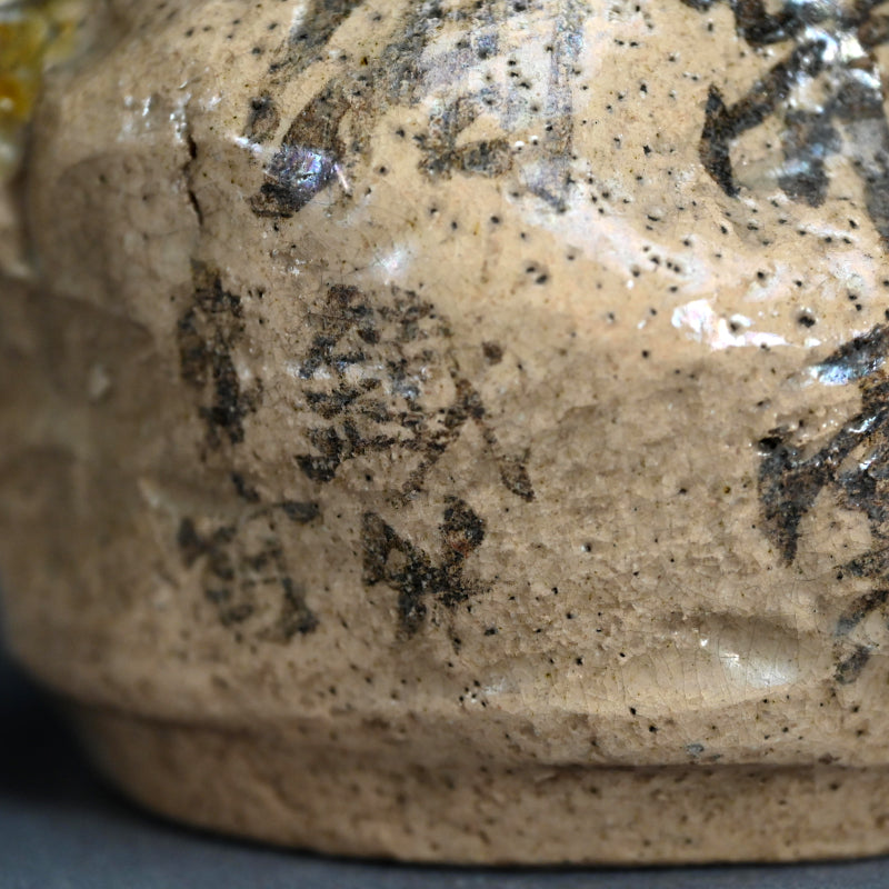 粗い粘土で作られた 花瓶です。宝袋にもたれかかる福の神、布袋の向かいには 富岡鉄斎による短い詩が描かれており、「鉄斎先生壺 花瓶」と題された古い木箱に収められています。伝説の文人によって手描きされた袱紗が付属しています。花瓶のサイズは16 x 18 x 14.5 cmで 状態は良好です。袱紗は絹本に手描きされ、長寿の神、コウモリ、鹿が描かれ 富岡鉄斎の署名と大正元年(1912) 12月の日付が入っています。サイズは33 x 36 cmで 状態は良好です。