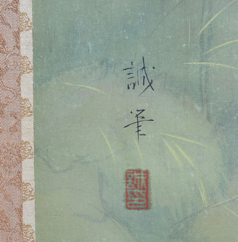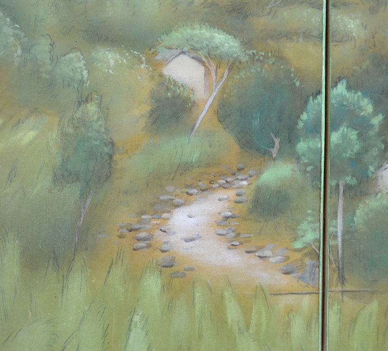 It is 142 x 158.5 cm (56 x 62 1/2 inches), and is in good condition. A stream meanders through verdant hills populated by tiled roofs rising above the brilliant foliage on this small two panel screen dating from the early Showa period (1925-1930s) signed Makoto. Pigment on silk in the original silk border with a wooden frame. It is Possibly the work of Iwate artist Endo Makoto (b. 1891).