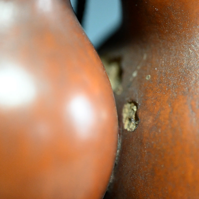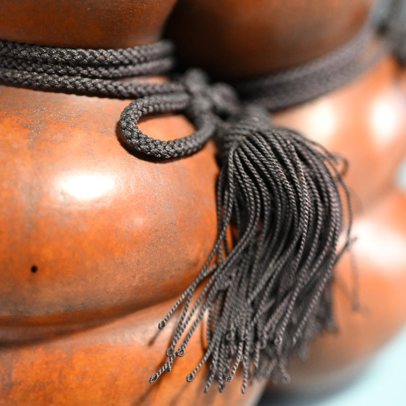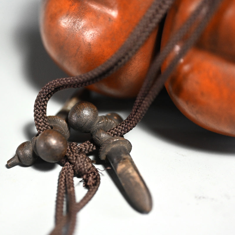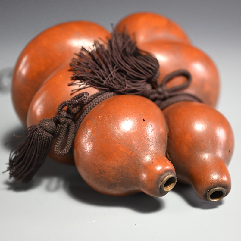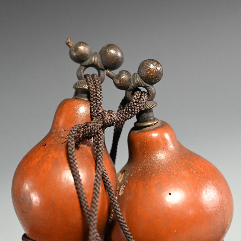 双子のように一緒に育った一対のひょうたんです。木彫りの蓋が付いており、年月の経過で少々黒ずんだ展示箱に収められています。「和合瓢」と題され 嘉永3年(1850年)の日付が記されています。"松竹" という署名もあります。サイズは 14 x 9.5 x 18.5 cmで状態は良好です。