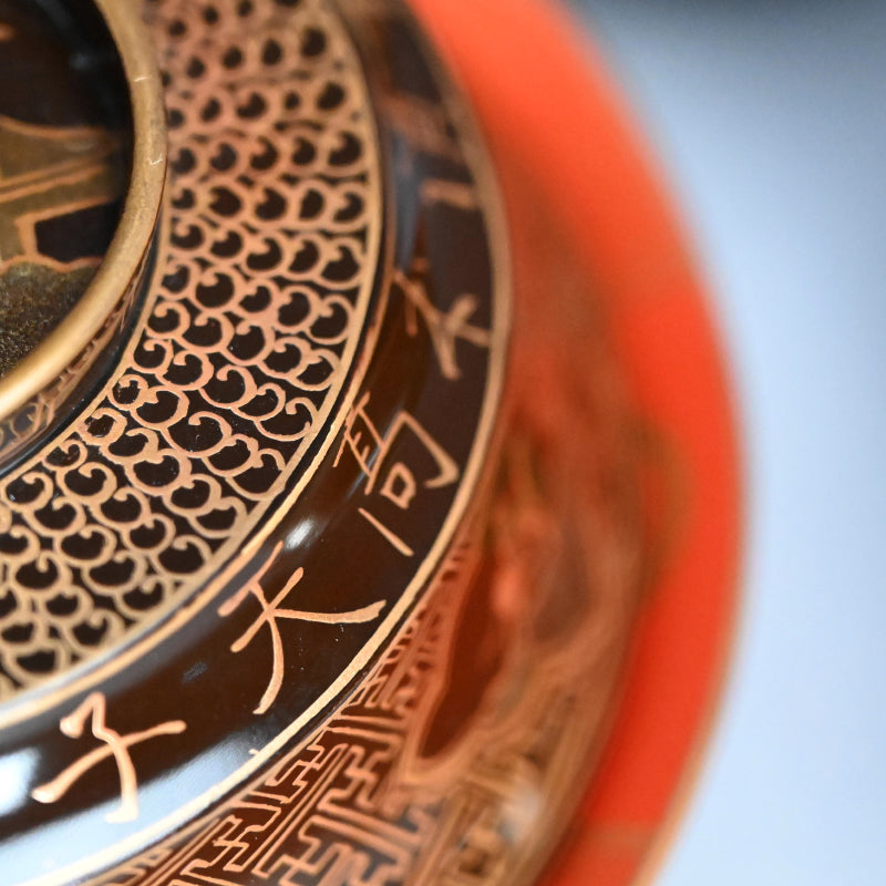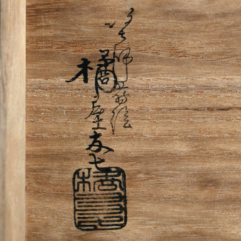 橘屋友七は 京都の著名な漆器職人:長野横笛の跡を継いだ人物で、横笛は漆器店「橘屋」を創業しました。二代目の代で事業は繁栄しましたが、三代目が早逝したため屋号は横笛の弟子である浅野 友七に継承されました。彼の生没年は定かではありませんが(1860年に亡くなったとする説や、1872年と1878年の京都博覧会の記録に「浅野友七博覧会会社」の記載があり、浅野宗七や浅野孫七の名も見られます)、横笛の弟子であった初代友七は江戸時代末期に亡くなり、その子孫あるいは親族が事業を継承したと考えられます。ミホミュージアム所蔵の松竹梅で装飾された優美な重箱など、橘屋ゆかりの漆器は長野横笛から受け継がれた洗練されたスタイルを反映しており、堅い蝋色の漆と絶妙なバランスの蒔絵装飾は展示にも実用にも適しています。