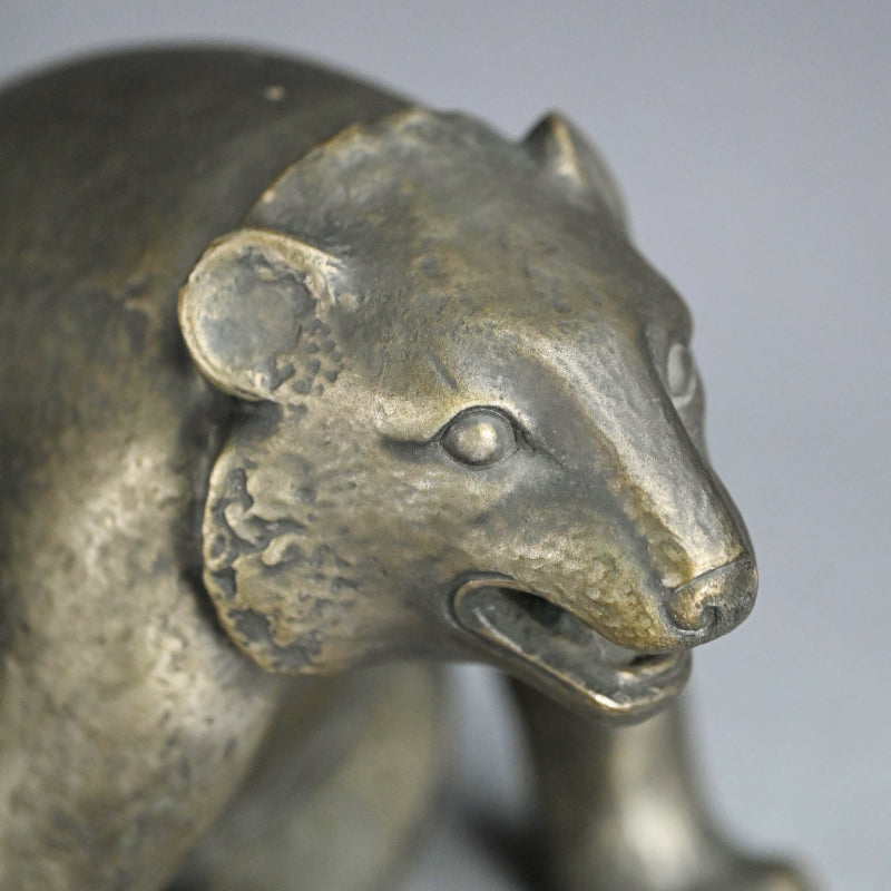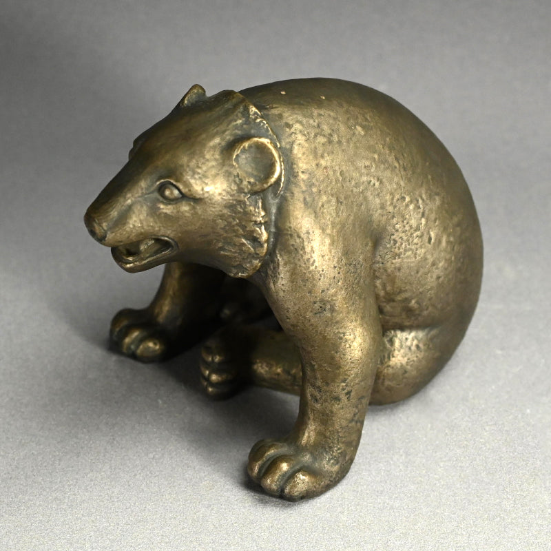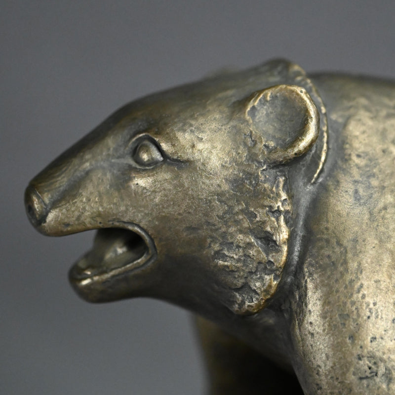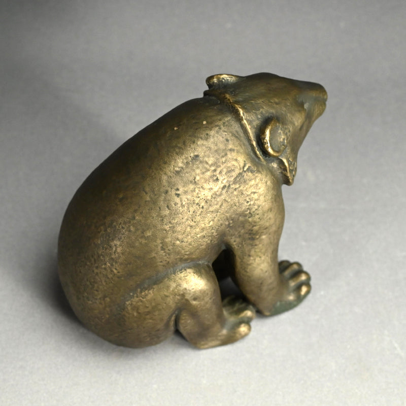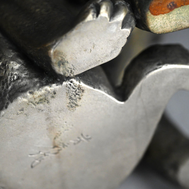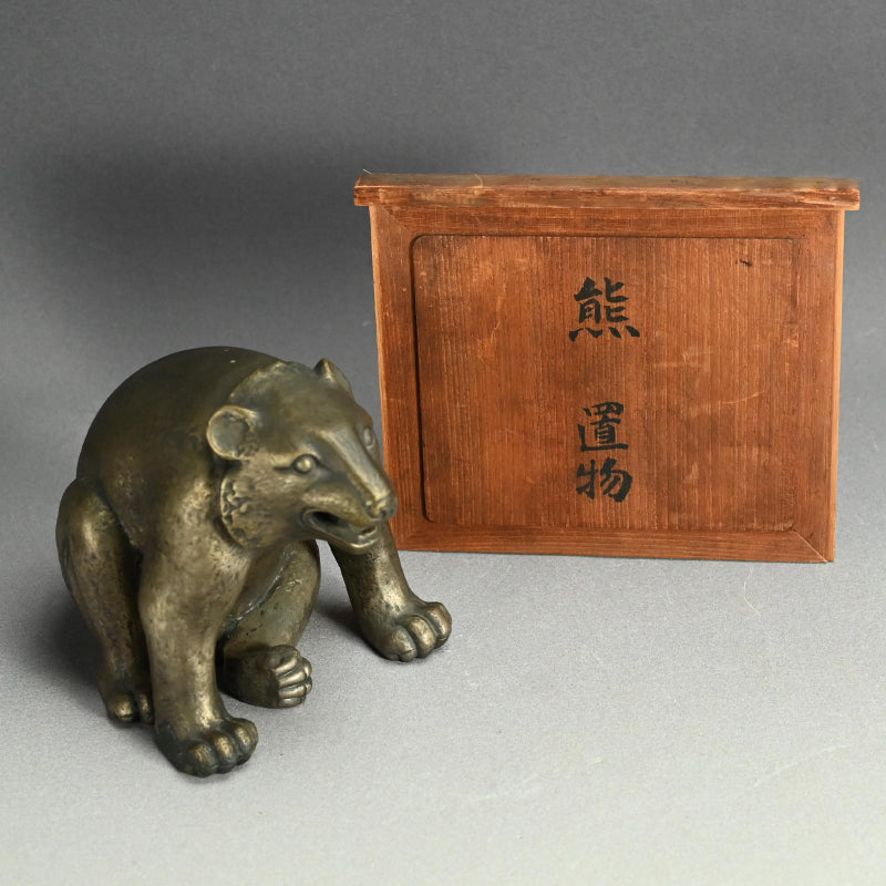 介川 芳秀による重厚な白銅製の熊の置物です。オリジナルの銘木箱に収められています。サイズは15.5 x 19.5 x 17cm、重量は3.75kgです。経年による変色は見られますが、状態は良好です。
