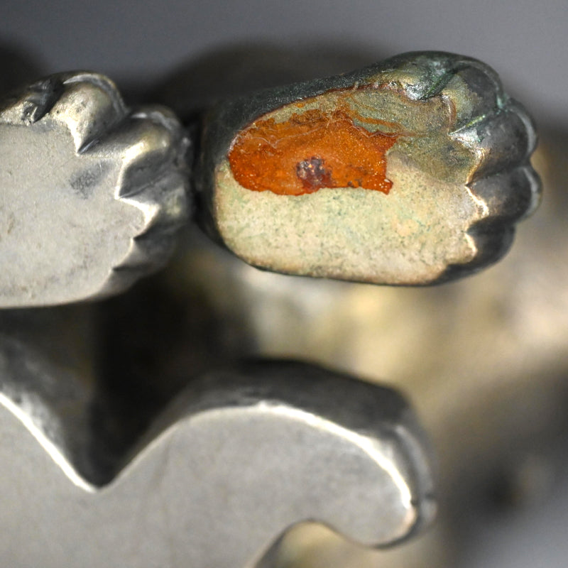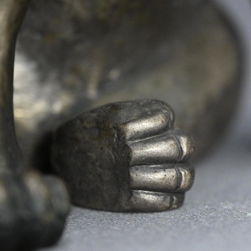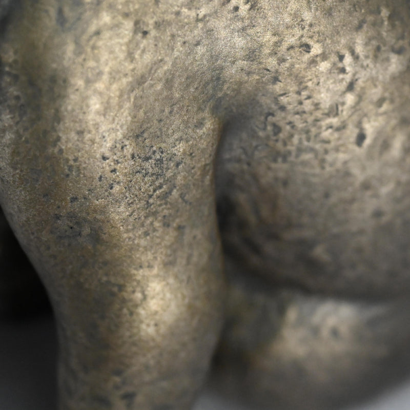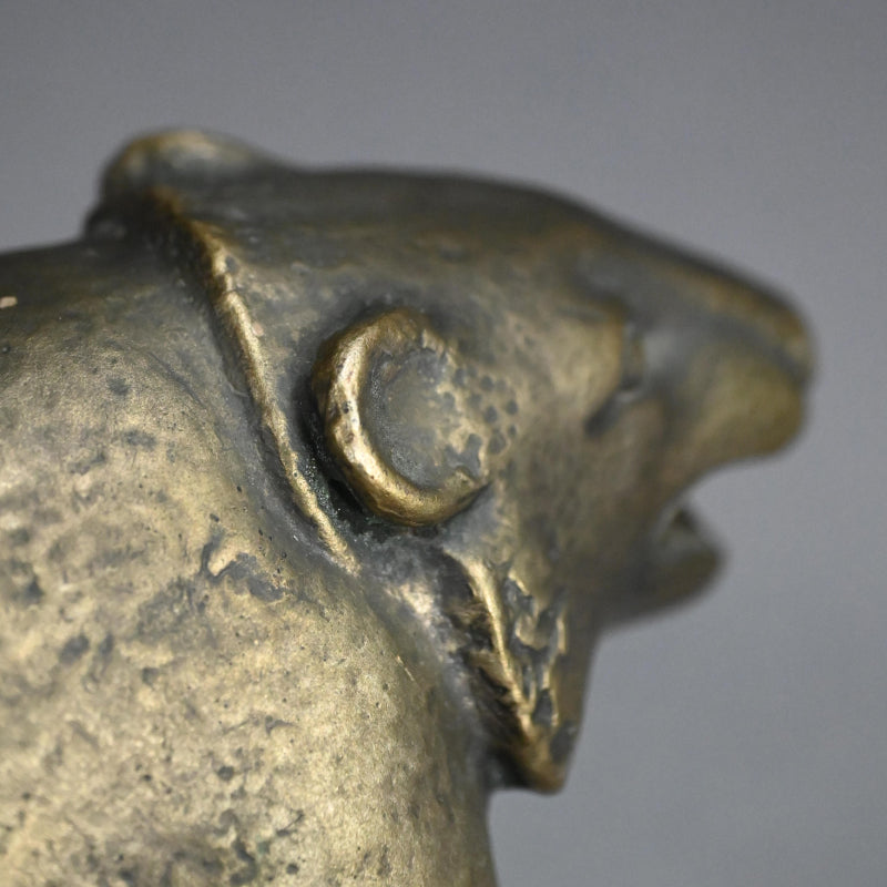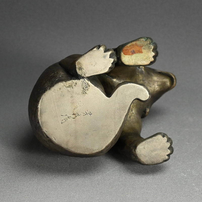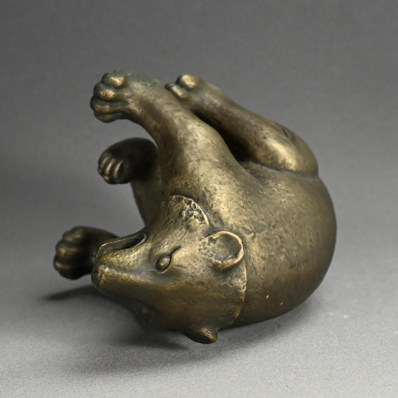 介川 芳秀による重厚な白銅製の熊の置物です。オリジナルの銘木箱に収められています。サイズは15.5 x 19.5 x 17cm、重量は3.75kgです。経年による変色は見られますが、状態は良好です。