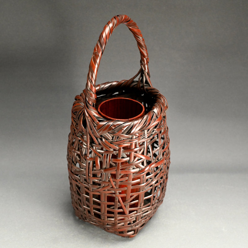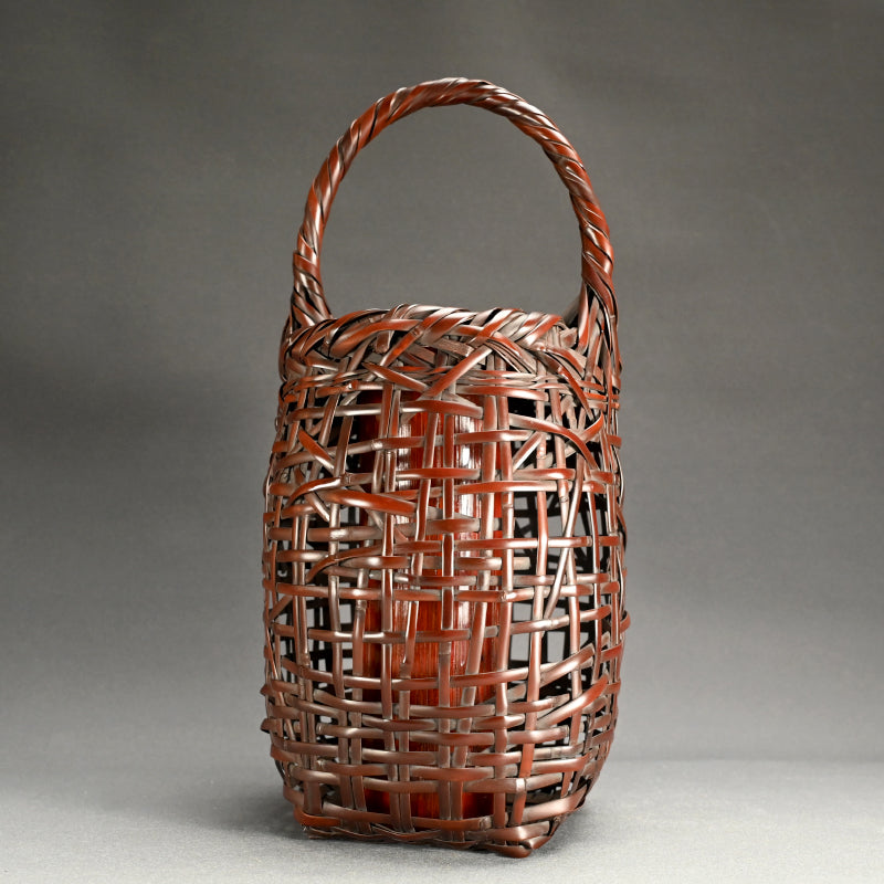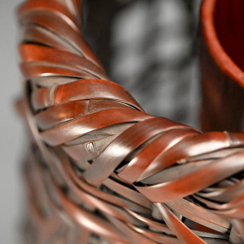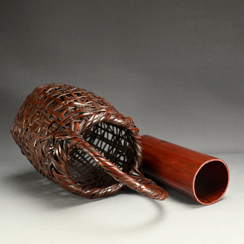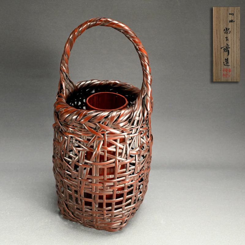 A basket of dark red bamboo woven by the 4th generation Hayakawa Shokosai IV enclosed in the original signed wooden box. It is 22.5 cm (9 inches) diameter, 48 cm (19 inches) tall and in excellent condition.