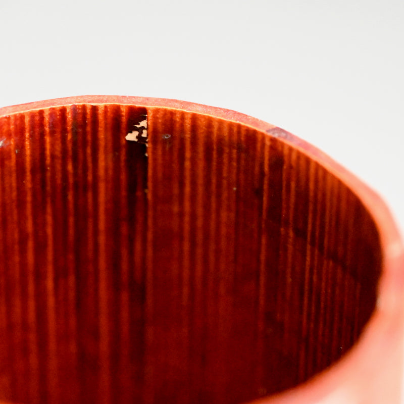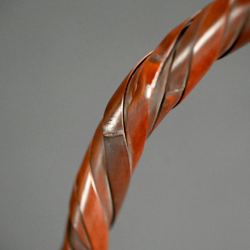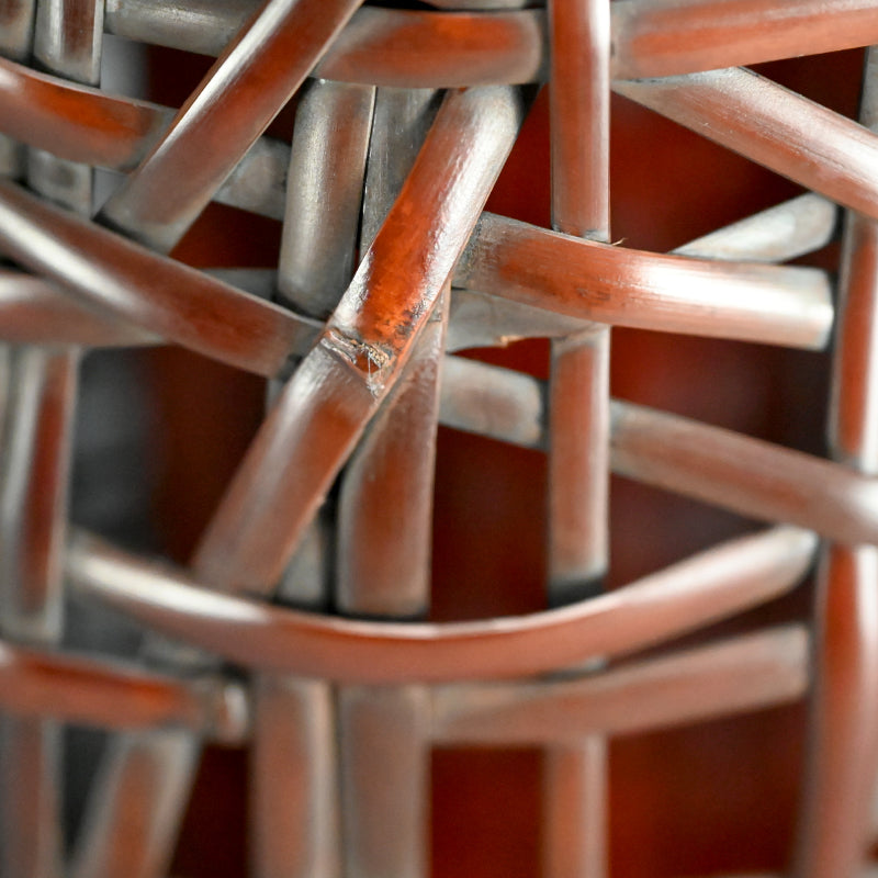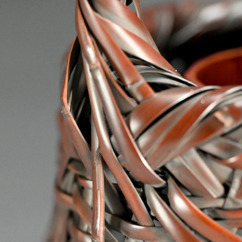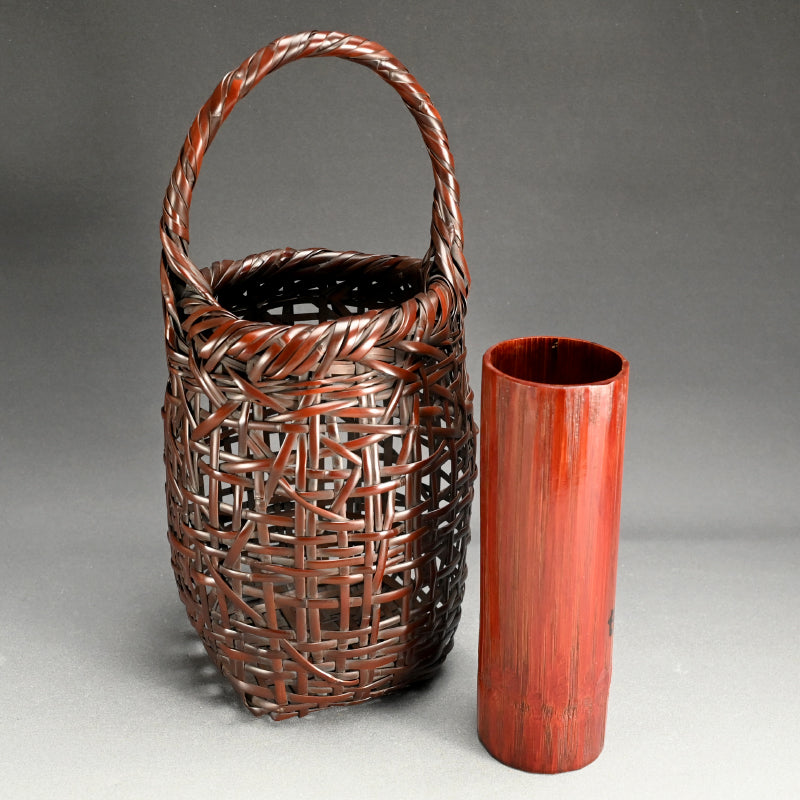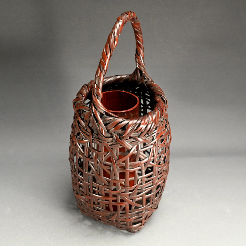A basket of dark red bamboo woven by the 4th generation Hayakawa Shokosai IV enclosed in the original signed wooden box. It is 22.5 cm (9 inches) diameter, 48 cm (19 inches) tall and in excellent condition.