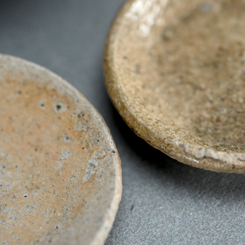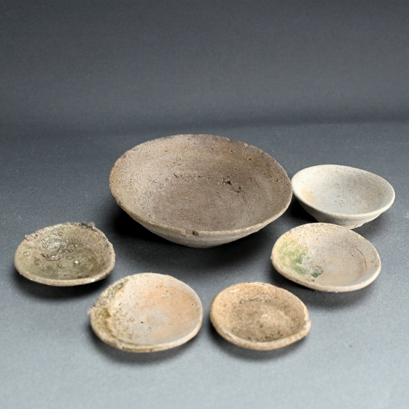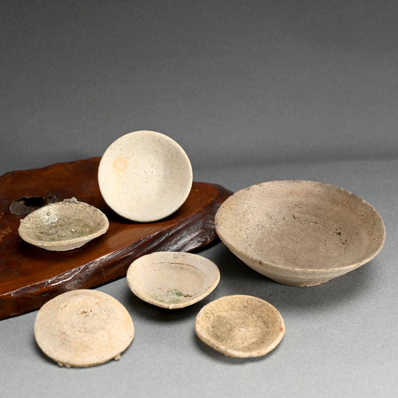 平安時代 後期から鎌倉時代(12~14世紀)にかけての瀬戸地方の小皿5枚と大鉢1枚のセットです。山茶碗と呼ばれるこの鉢は 淡い灰色で、直径約16cm、高さ約5.5cmです。小皿は淡い白色の生土から灰が散りばめられた黄色まで様々で、直径は7.5~9.5cmです。