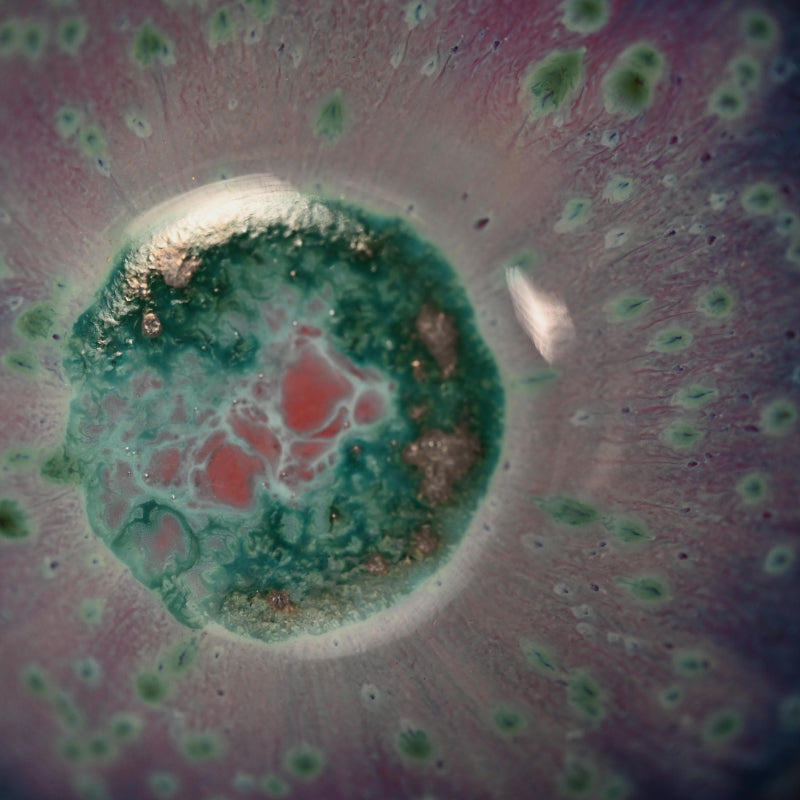 Two exquisite tenmoku shaped Chawan Tea Bowls covered in pink Peacock Glaze by early female artist Matsuyama Gae II enclosed in the original signed wooden box.  One nests inside the other, 13 cm and 12 cm diameter respectively, 7 and 6.5 cm tall.  Both are in perfect condition. They come with the original introductory pamphlet and stamped cloth wrapping.