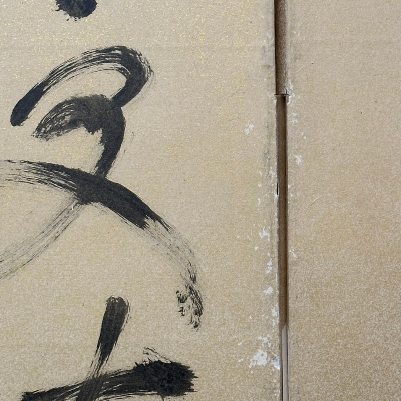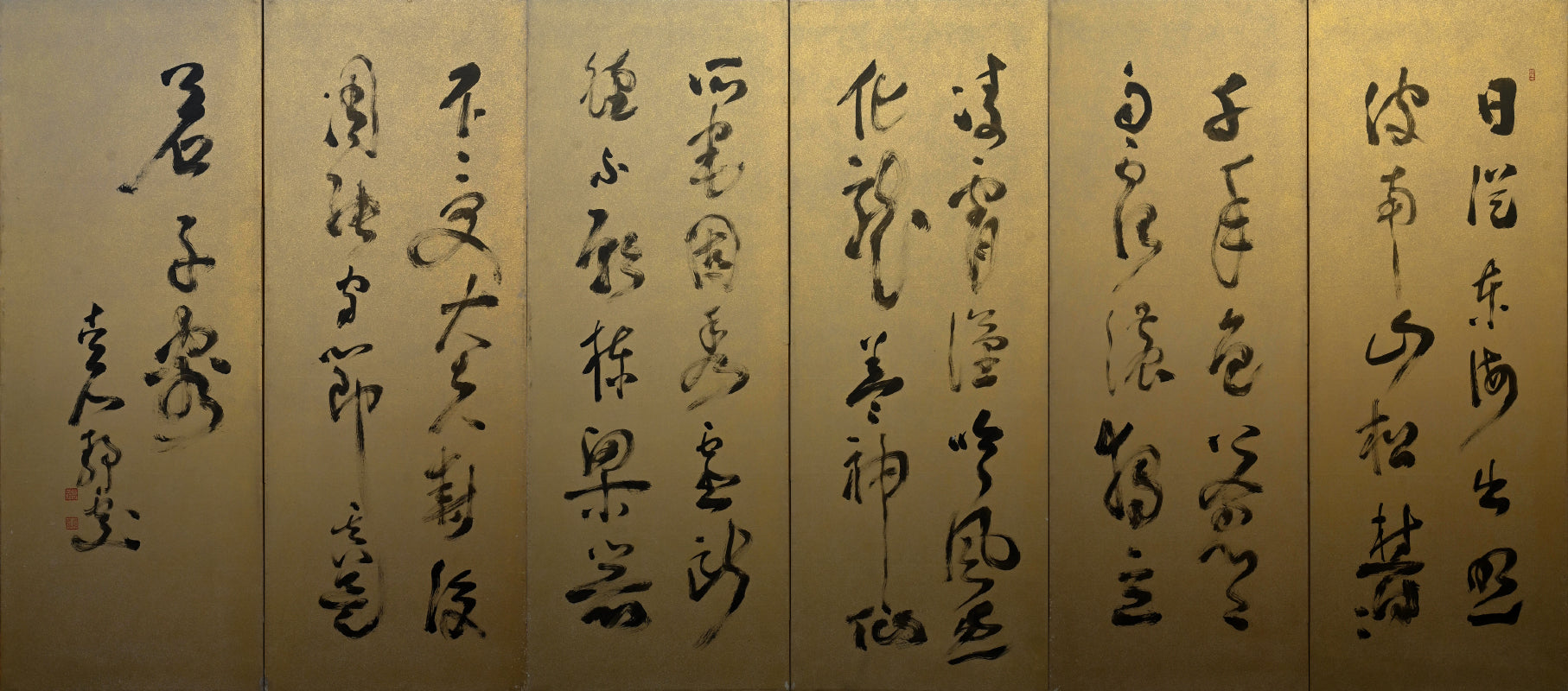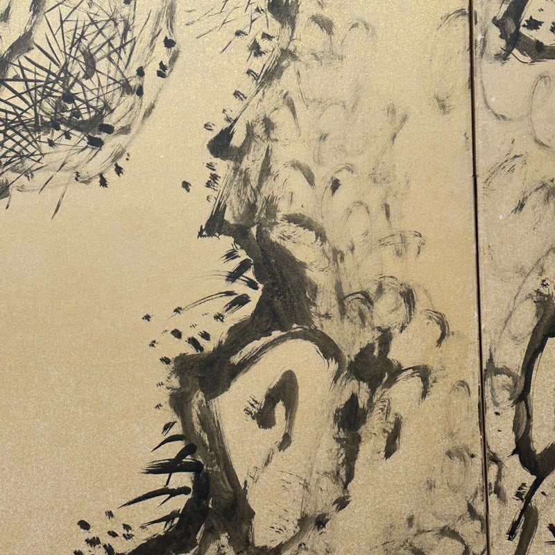 A pair of rare Six Panel Screens opposing calligraphic verse with a painting of a solitary pine by Fukuda Kodojin. Rendered with expressive, calligraphic brushwork, the pine—a classic emblem of steadfastness and integrity—is depicted with bold, almost sculptural vigor. Kodojin’s brush alternates between dry, rugged strokes that describe the gnarled bark and sweeping wet washes that soften the contours, evoking both age and vitality. Against the luminous gold ground, the pine emerges not merely as a botanical study but as an embodiment of the literati ideal—enduring, solitary, and attuned to stillness. The sparse composition leaves vast negative space, emphasizing the painting’s meditative quality. Kodojin’s inscription, which appears to read Visited by an Immortal, lightly placed at the lower right, completes the poetic atmosphere of transcendence. The companion screen bears a long poetic inscription, its calligraphy as fluid and expressive as the pine’s linework. The verse, written in Kodojin’s distinctive semi-cursive hand, moves rhythmically across the six panels, breathing with pauses and accelerations that mirror the inner cadence of thought. The brush alternates between moments of dense, ink-laden force and airier, dancing traces, revealing a unity between writing and painting that defines Kodojin’s mature style. Together, these screens represent the bunjin (literati) synthesis of painting and poetry. The painting embodies the poem’s spirit; the poem articulates the painting’s silence. Ink and applied gold on paper, the screens measure 369 x 171.5 cm each (roughly 145 x 67-1/2 inches). There is some loss to the paper surface from rubbing together on the inside hinges, otherwise the screens are in decidedly excellent condition.
