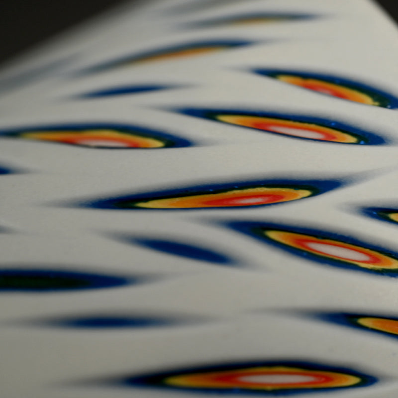 A boxed set of exquisite hand cut mugs by Kitagawa Kazuki enclosed in the original signed wooden box titled Kasane-iro Kohi-wan. Each is 8 cm (3 inches) diameter, roughly the same height and in excellent condtion, directly from the artist. The artist creates each of these cups individually by pouring liquified porcelain into a mold, swirling it around, allowing it to dry slightly, then pouring it out and adding another layer of differing color. After removing it from the mold and drying, each piece is hand etched to reveal the various layers of color in vibrant beams like sunlight through a rainbow.