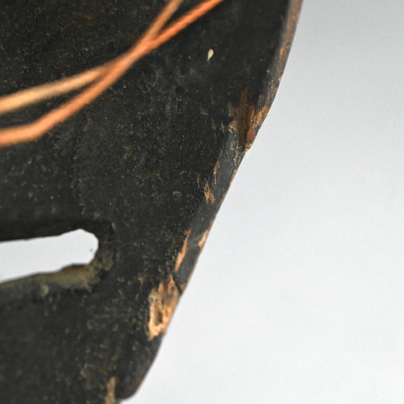 Karasu Tengu Demon Mask dating from the Kamakura to Muromachi period carved of wood covered in polychrome red and black with outrageous features and curly hair. This image of a bird-beaked Tengu with furled brows, bulging eyes an oversized nose was carved between the 12th and 14th centuries. The overall carving style and coloration including chisel marks on the back are consistent with the dating and the close set irises of the eyes, looking downward, is a feature of this early era. The mask is 21.5 x 14.5 x 8 cm (8-1/2 x 5-3/4 x 3 inches). It has been broken and re-attached down the left side of the face. It comes in an old kiri-wood storage box.