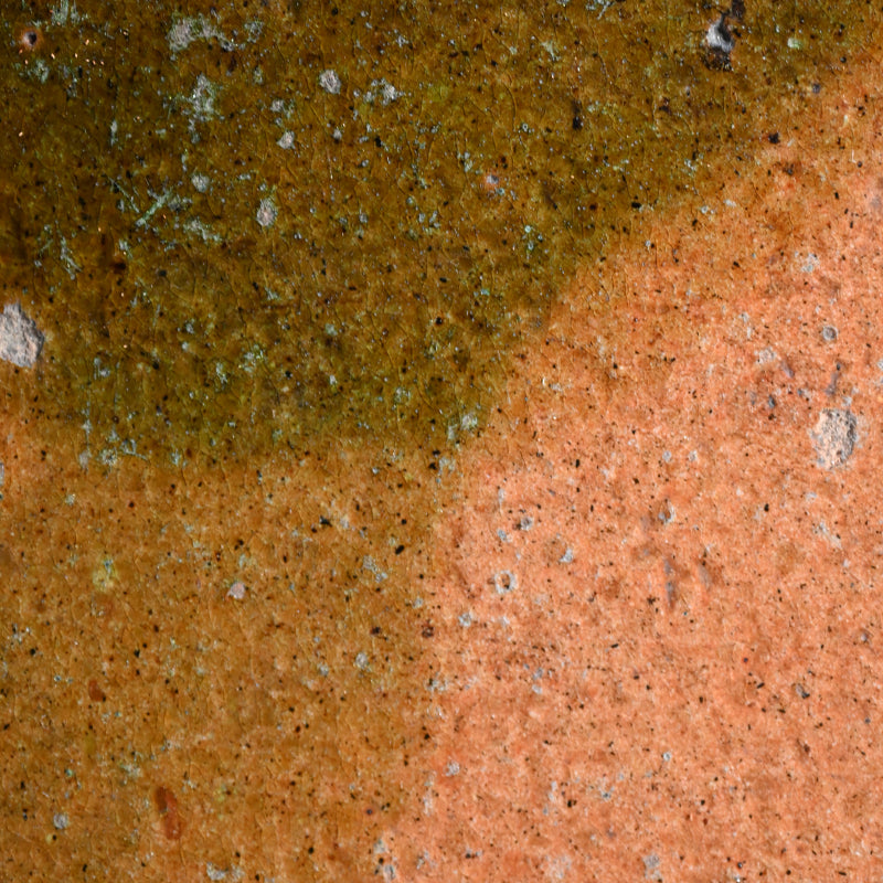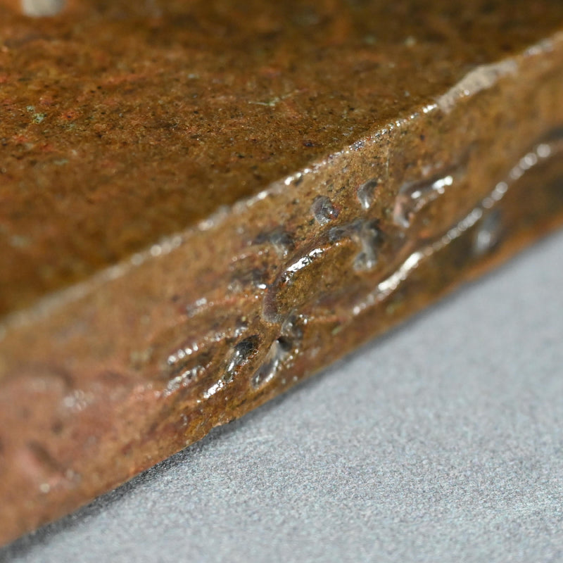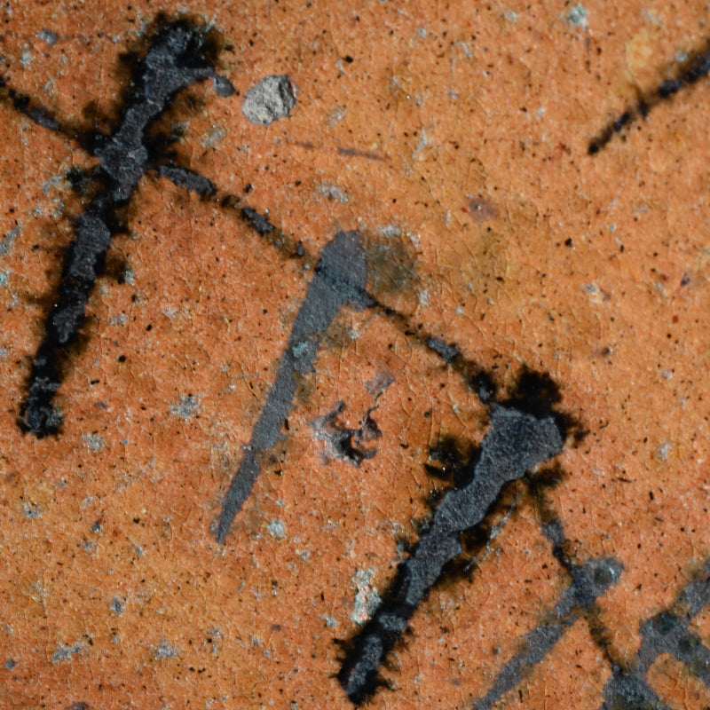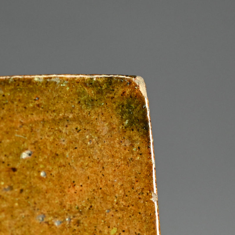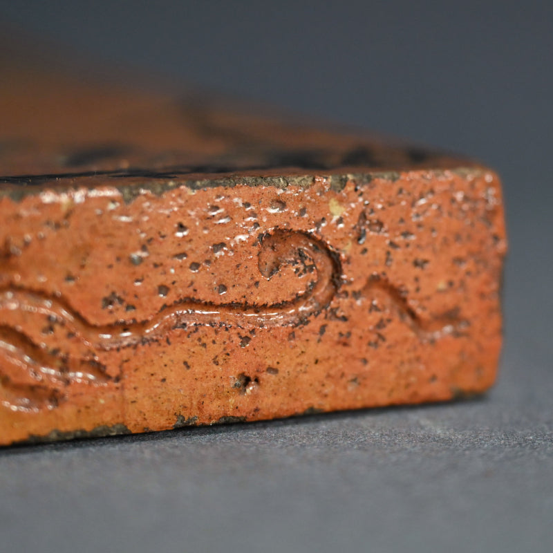 An exquisite 19th century tile in burnt orange clouded with green, a sprig of dry grass growing up in rich iron silhouette on one corner. This was made to hold the Furo brazier during the making of Maccha tea in the Japanese Tea Ceremony. It is 24 x 24 x 3 cm (9-1/2 x 9-1/2 x 1 inches) and is in overall fine condition, with two firing cracks along the green edge typical of wood fired solid slab pottery. The tile comes enclosed in a period wooden box titled simply Furo-ita. In the Japanese tea ceremony, the furo is the portable brazier used to heat water for tea. Its purpose and timing are closely tied to seasonality, aesthetics, and the philosophical rhythm of the tea year.