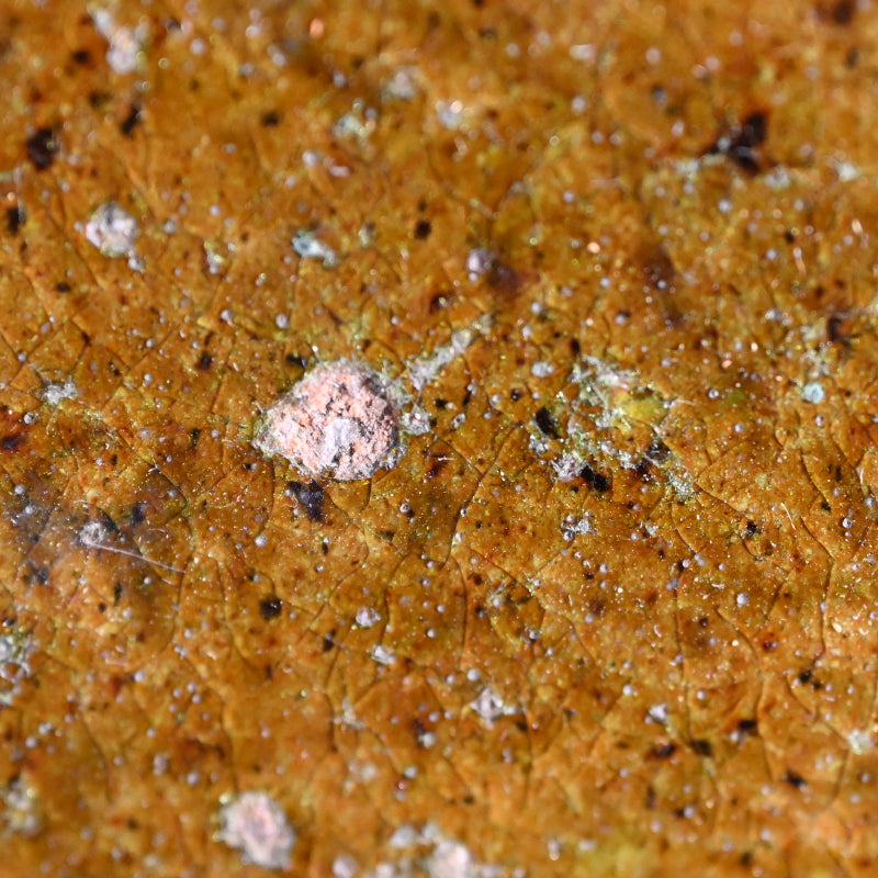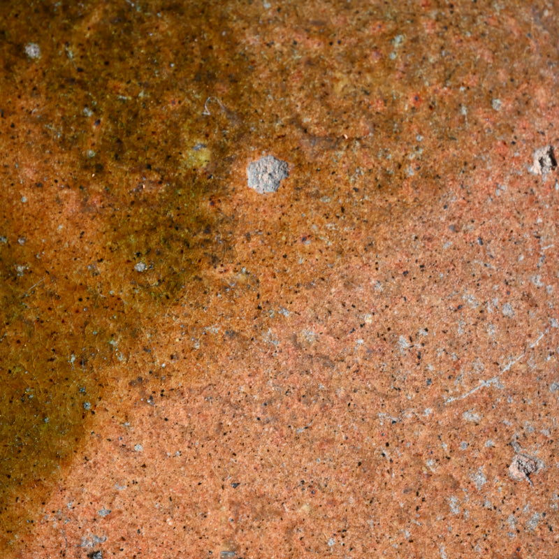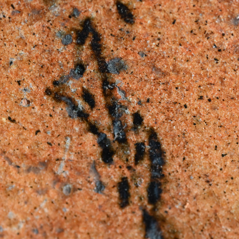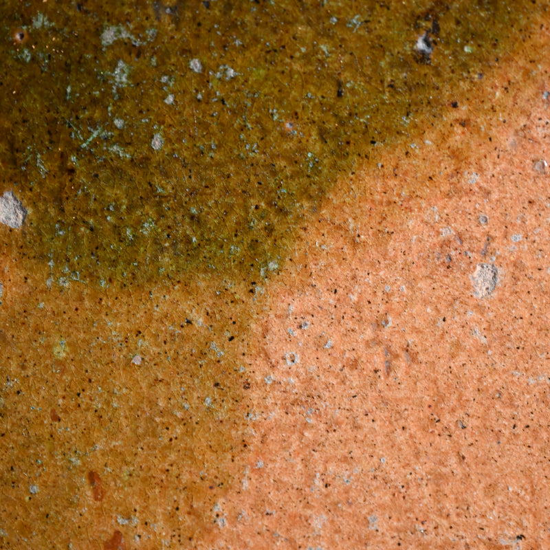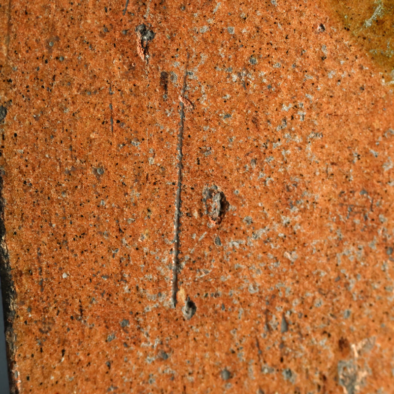 An exquisite 19th century tile in burnt orange clouded with green, a sprig of dry grass growing up in rich iron silhouette on one corner. This was made to hold the Furo brazier during the making of Maccha tea in the Japanese Tea Ceremony. It is 24 x 24 x 3 cm (9-1/2 x 9-1/2 x 1 inches) and is in overall fine condition, with two firing cracks along the green edge typical of wood fired solid slab pottery. The tile comes enclosed in a period wooden box titled simply Furo-ita. In the Japanese tea ceremony, the furo is the portable brazier used to heat water for tea. Its purpose and timing are closely tied to seasonality, aesthetics, and the philosophical rhythm of the tea year.