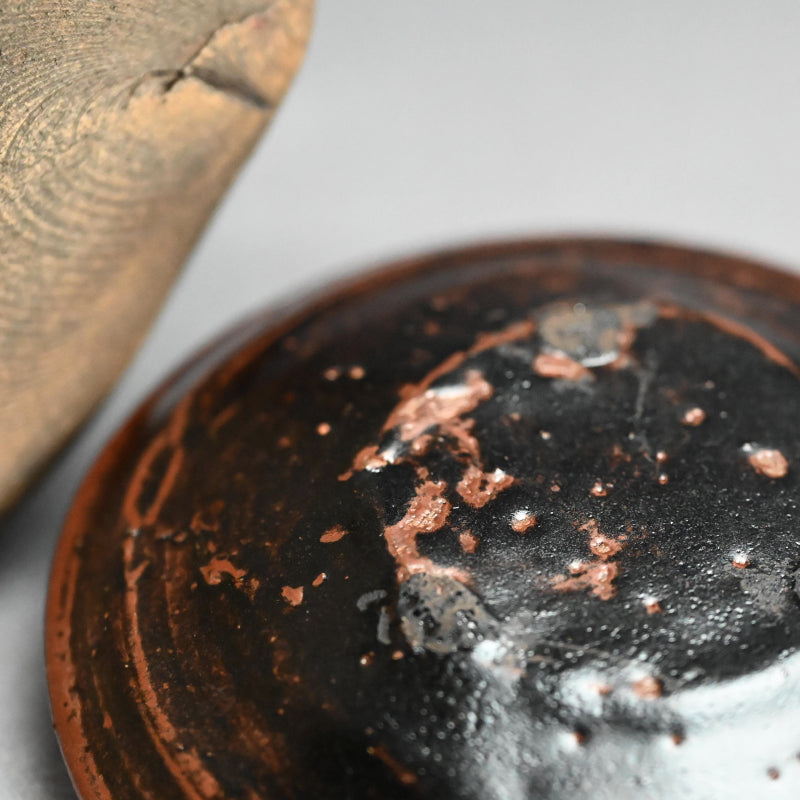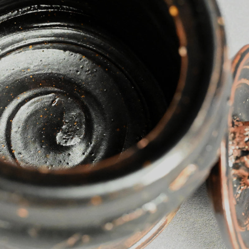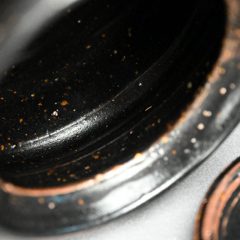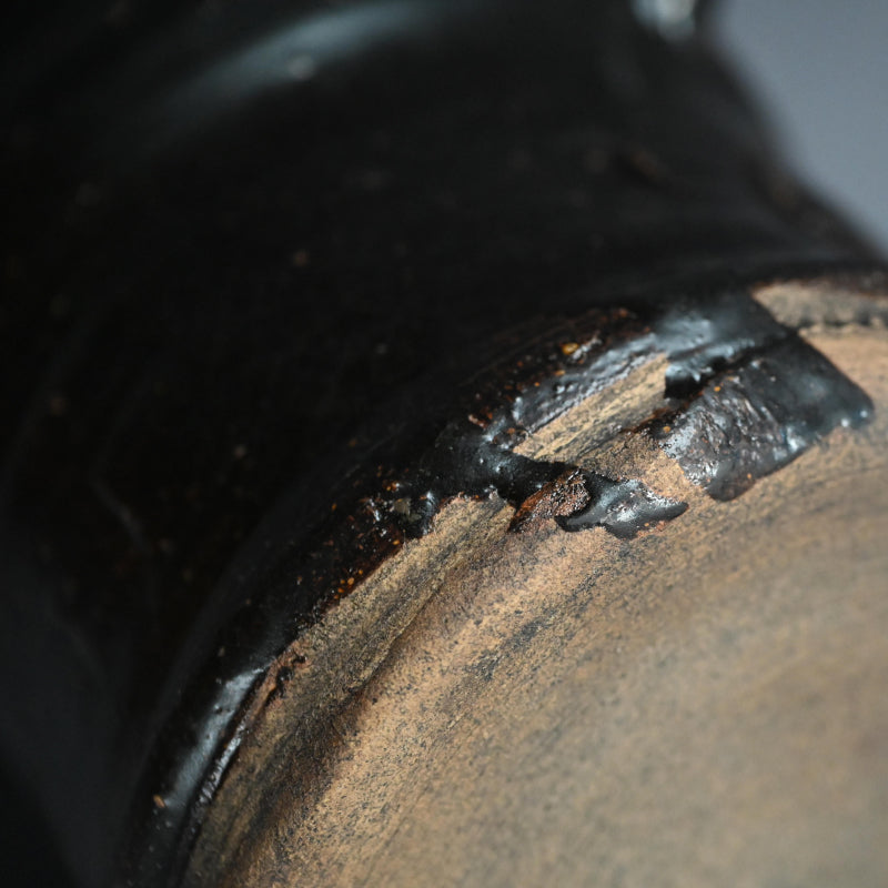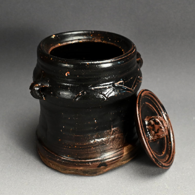 A classical Yahazuguchi Mimitsuki Mizusashi for use in the Maccha Tea Ceremony in russet iron glaze covered in black dating from the Edo to Meiji period enclosed in an old wooden box. It is 17 cm (7 inches) diameter, roughly the same height, and in excellent condition.