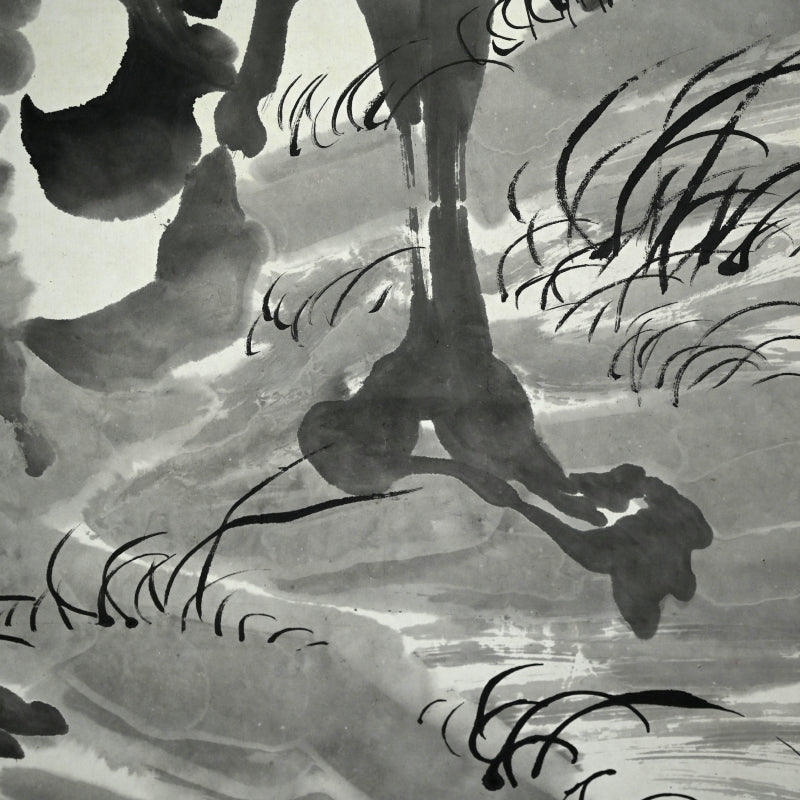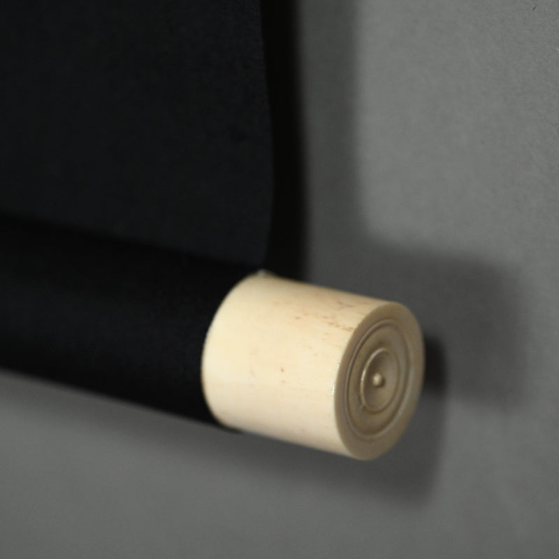 A skeleton sits among the dried grasses, alone and forgotten, perhaps reflecting on his life in this earie painting by Buddhist priest Higuchi Ryuon dated Meiji 15 (1882). Ink on paper, it is 75 x 184 cm (29-1/2 x 72-1/2 inches) and is in fine condition having been completely remounted in a border of black with colorful piping and features bone rollers.
