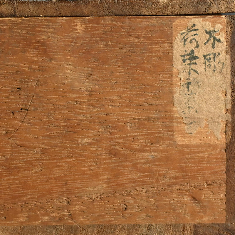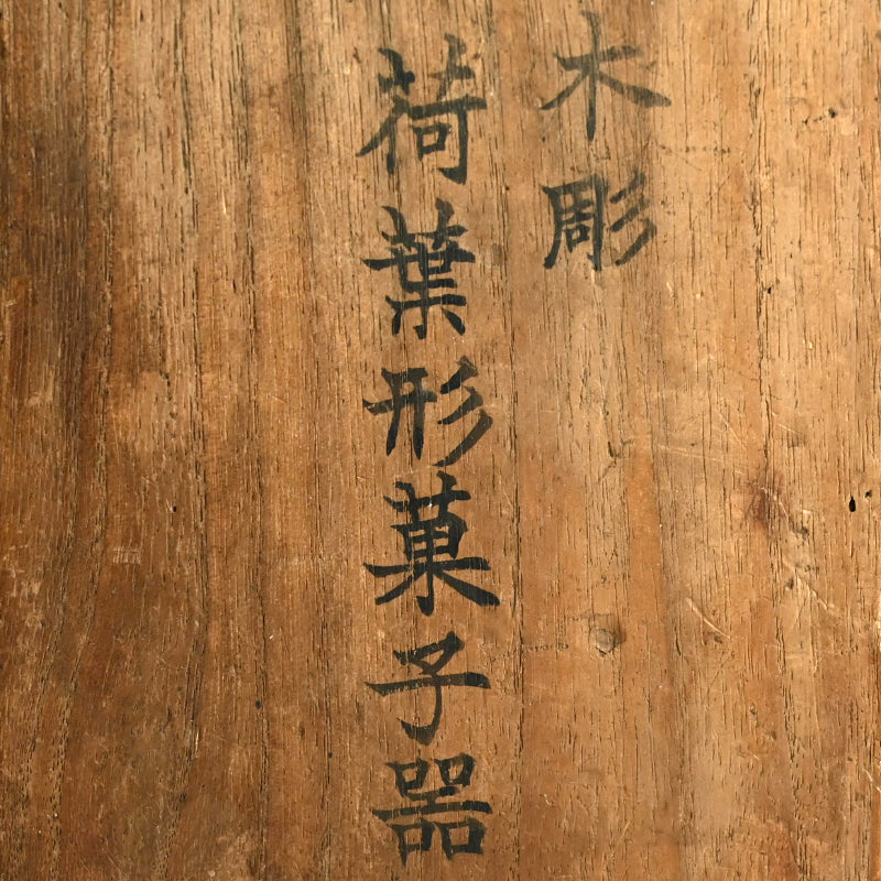 An exquisite basin carved of soft wood in the shape of a curling lotus leaf with another overlapping as the lid, a small water crab crawling inside signed underneath and enclosed in a period wooden box titled Mokucho Kayo-gata Kashiki. It is 15 x 10.5 x 5 cm (6 x 4 x 2 inches) and is in excellent condition.