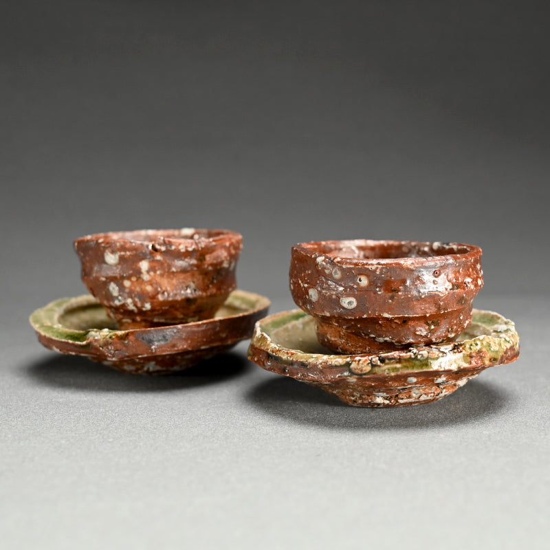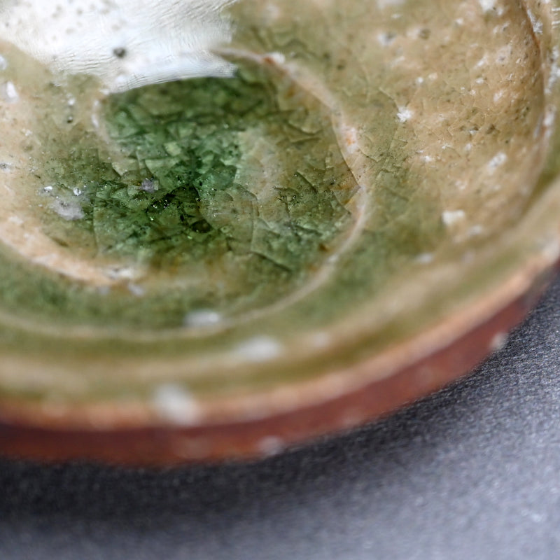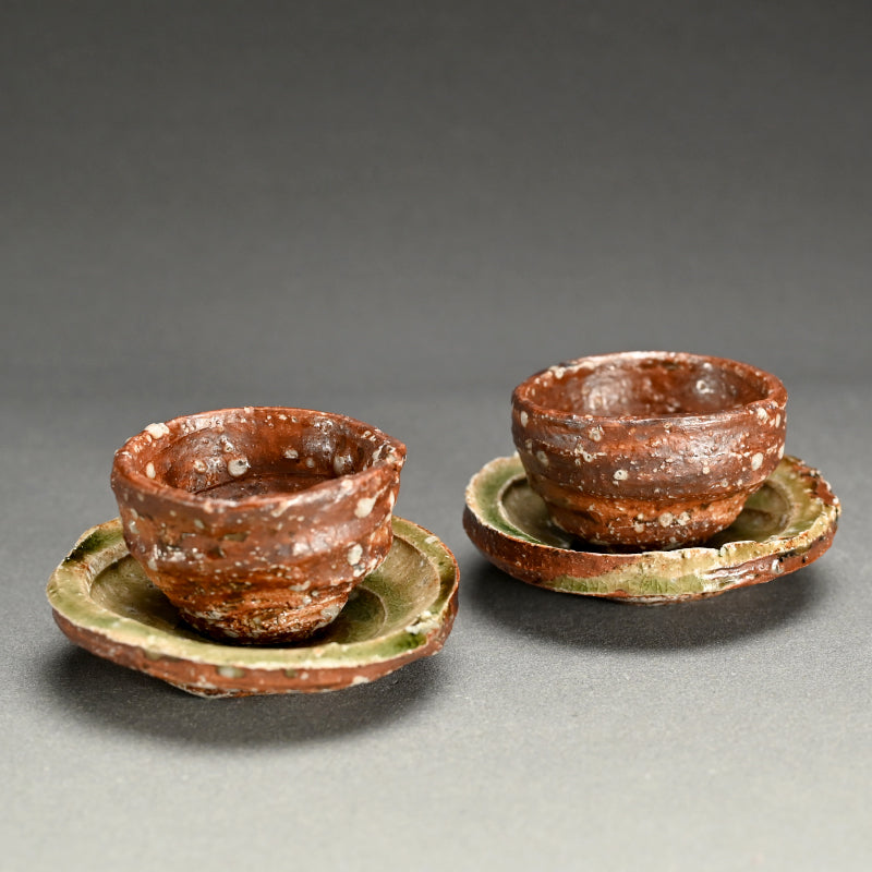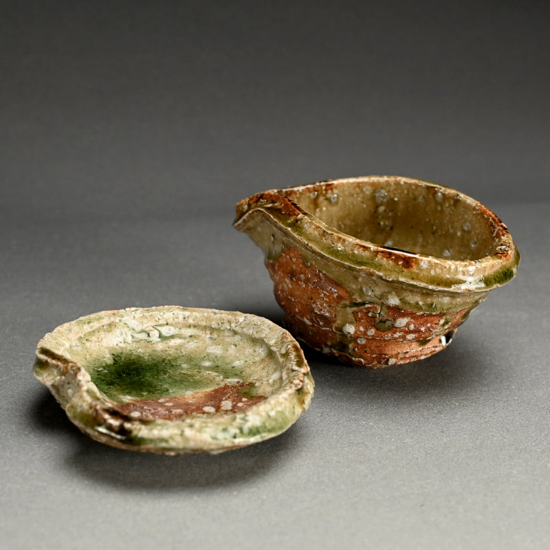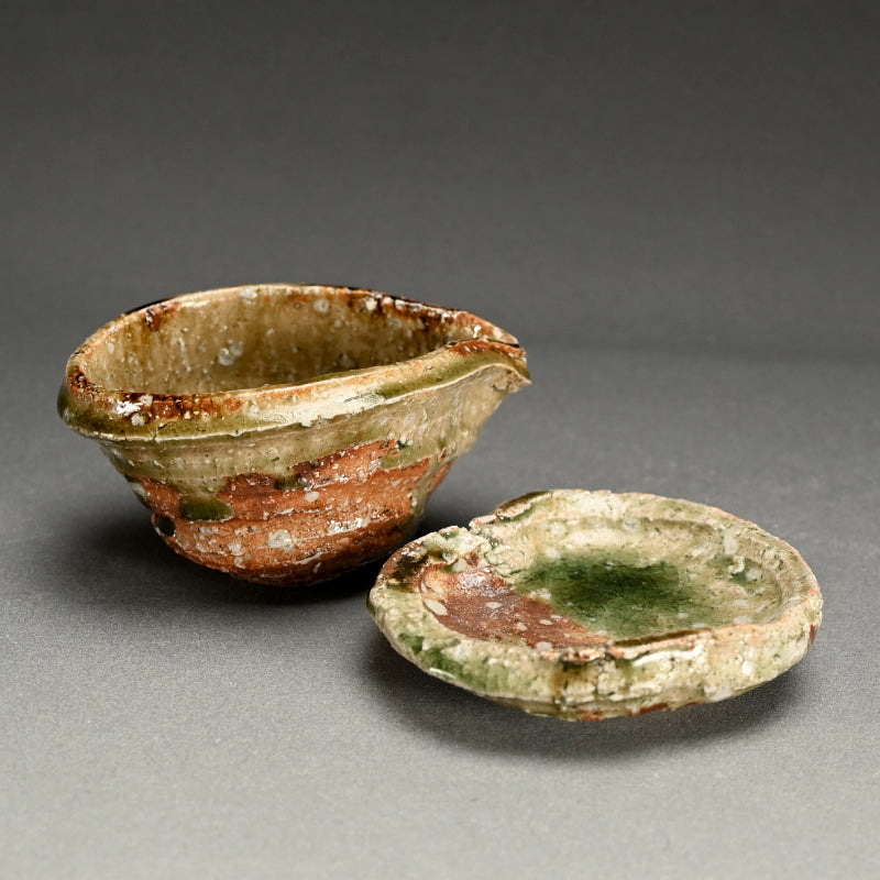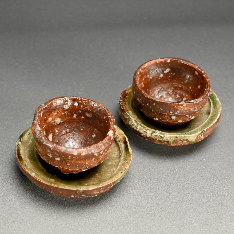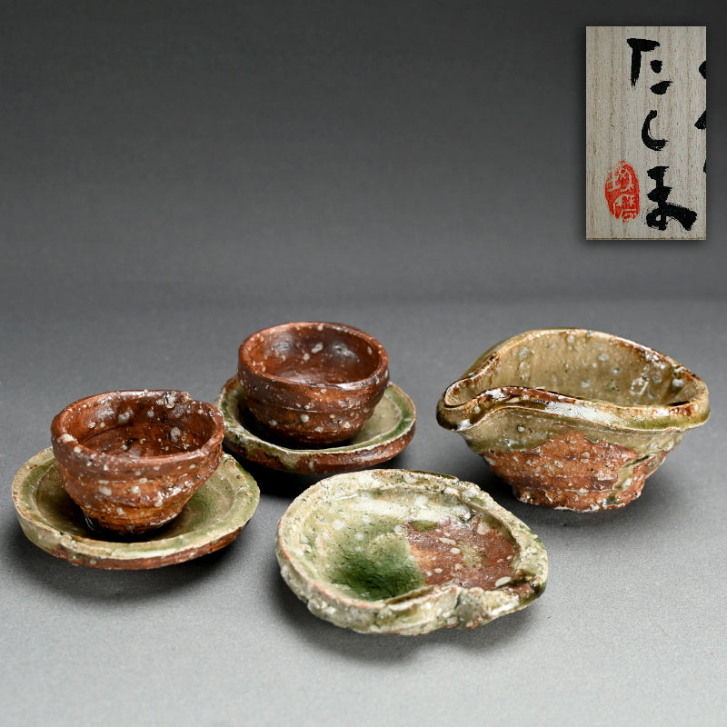 A fabulous boxed sake set for two consisting of a katakuchi server, a dish for snacks, two guinomi cups and two saucers, all in green Kunugi ash glaze. The Katakuchi is 15.5 x 11 x 7.5 cm (6 x 4-1.2 x 3 inches). The Small Plate: 12.5 x 11.5 x 3.5 cm (5 x 4-1/2 x 1 inches). The saucers are 11.5 cm (4-1/2 inches) diameter, the cups 8 cm (3 inches) diameter, 5 cm (2 inches) tall and all are in prefect condition, directlry from the artist this winter.