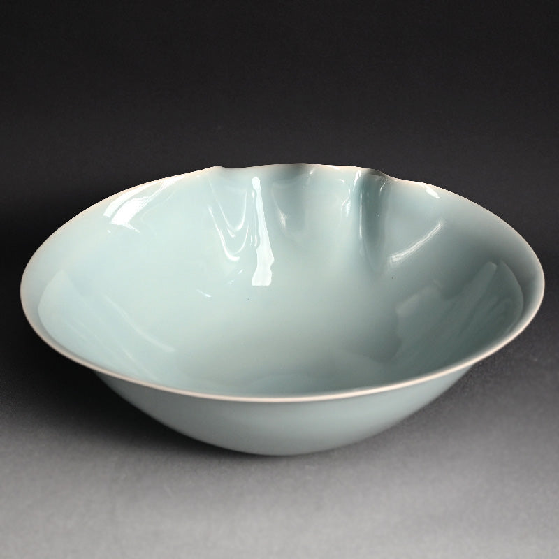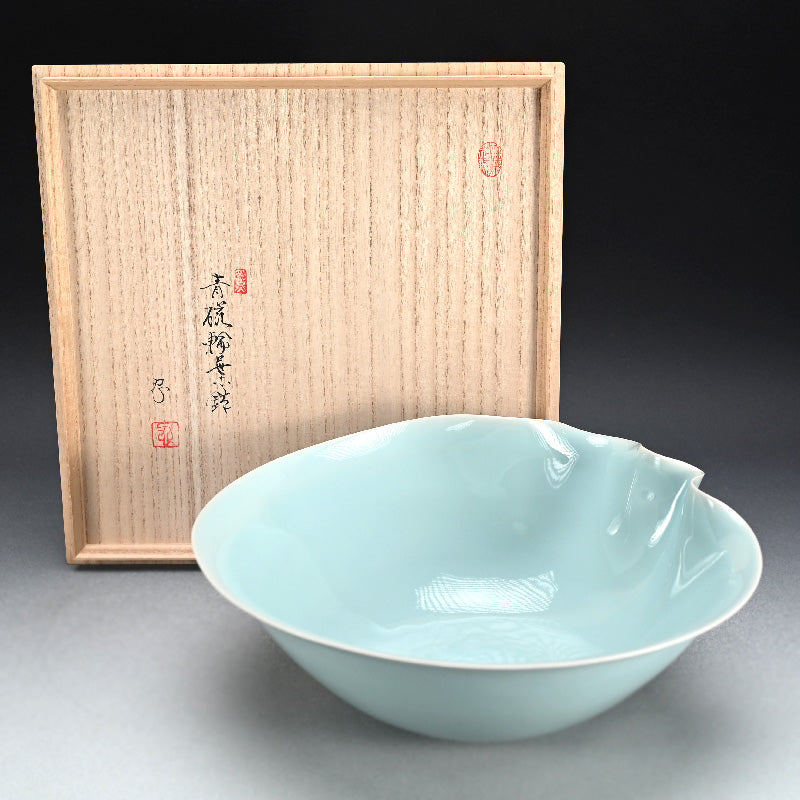 A dramatic randomly fluted celadon bowl by Kawase Shinobu enclosed in the original signed wooden box titled Seiji Rinka Bachi. It is 34.5 x 33.5 x 14 cm (13-3/4 x 13-1/4 x 5-1/2 inches) in excellent condition.
