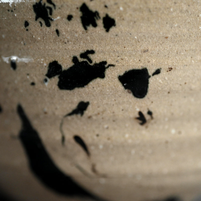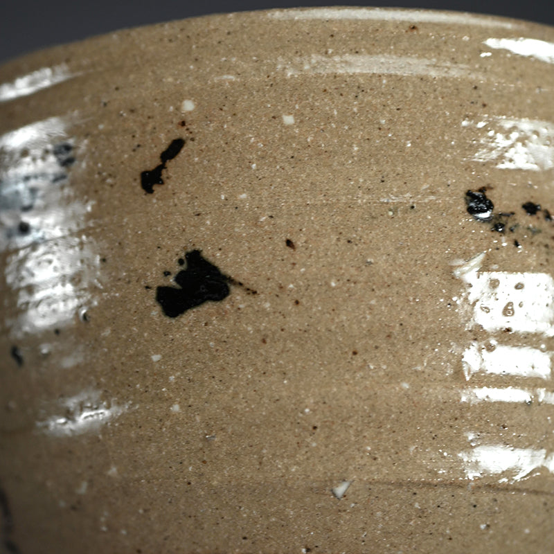 An earth toned wan-gata bowl decorated with dashes of black like the abstracted criss-crossing trunks and branches in a bamboo forest by Shigemori Yoko enclosed in a signed wooden box titled Chikurin Chawan. It is 14.3 x 13.3 x 9 cm (5-3/4 x 5-1/2 x 3-1/2 inches) and is in excellent condition.