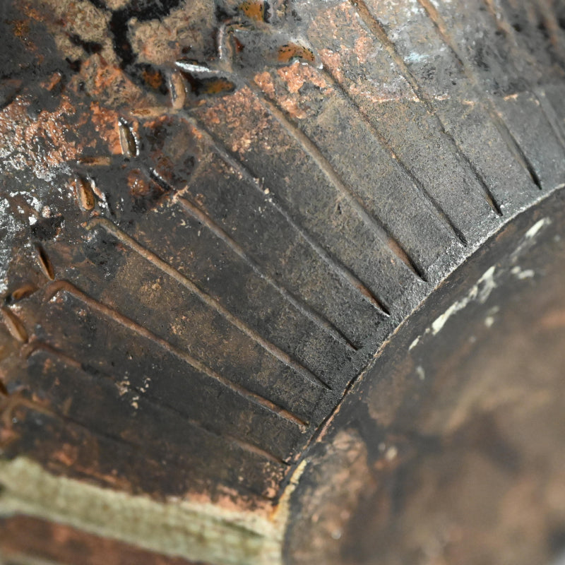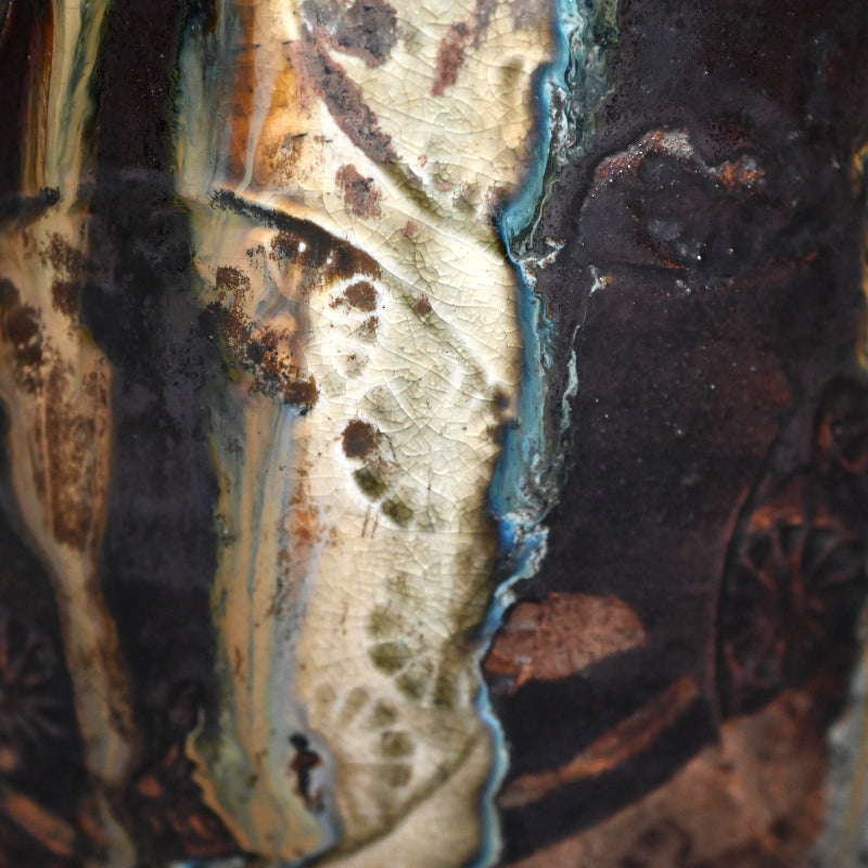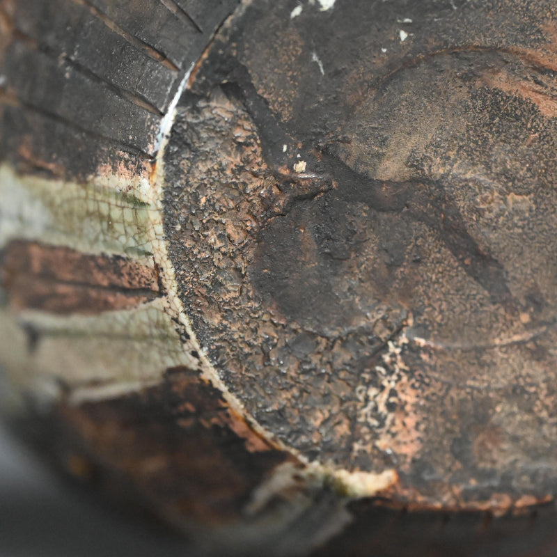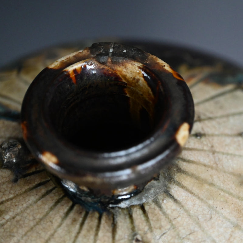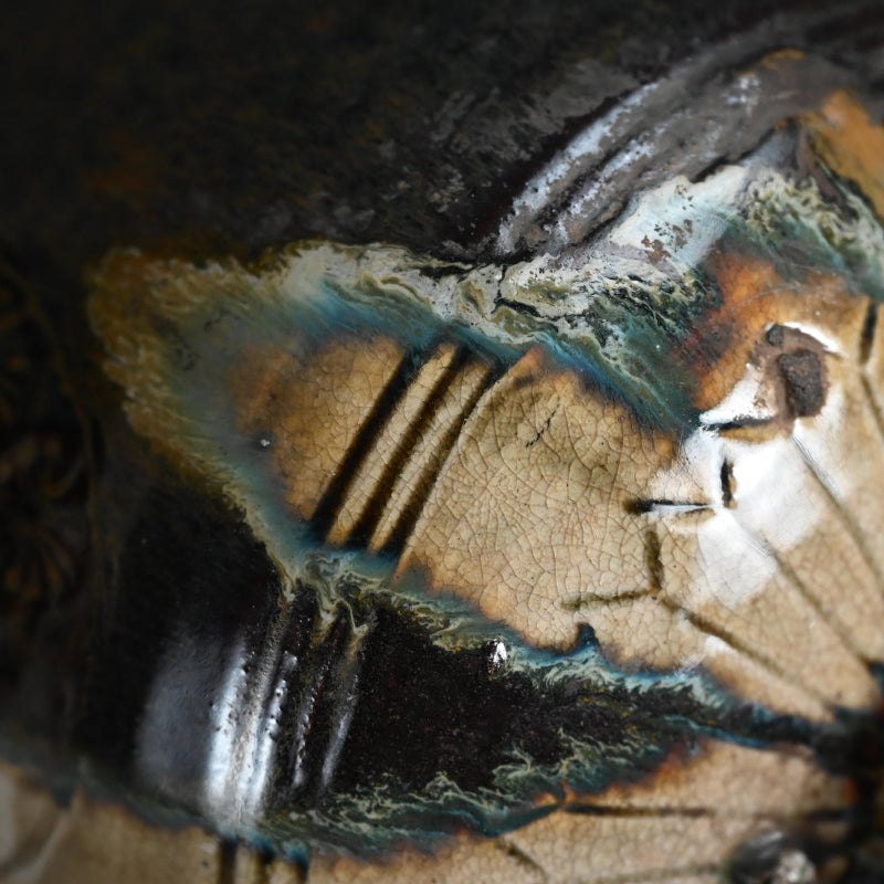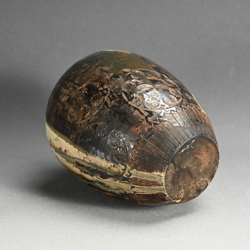 A stunning Bottle deeply incised with chrysanthemum petals about the rim, over three incised rings at the shoulder, with circles of flower impressions in the side covered in a an unusual combination of crackled cream, iron and green copper glaze. It comes in a fine red-lacquered wooden storage box titled Maru Kikumon Inka Heishi (Heiji). 19th century, it is 19.5 cm (8 inches) diameter, 27 cm (11 inches) tall and in excellent condition.