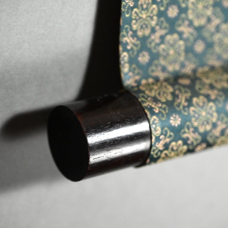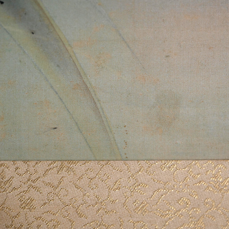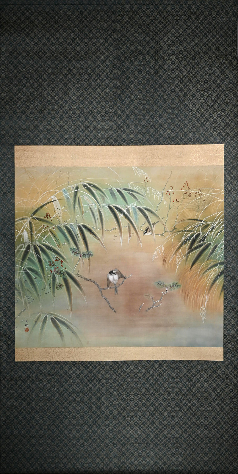 A large exhibition style painting by Uehara Gekkyo depicting the tranquility of the Japanese garden, a sprightly couple suspended over the open blank of misty water. Pigment on silk in a fine patterned blue silk border with large rosewood rollers. It is 98 x 201 cm (38-1/2 x 79 inches) and in excellent condition, enclosed in a period wooden box.