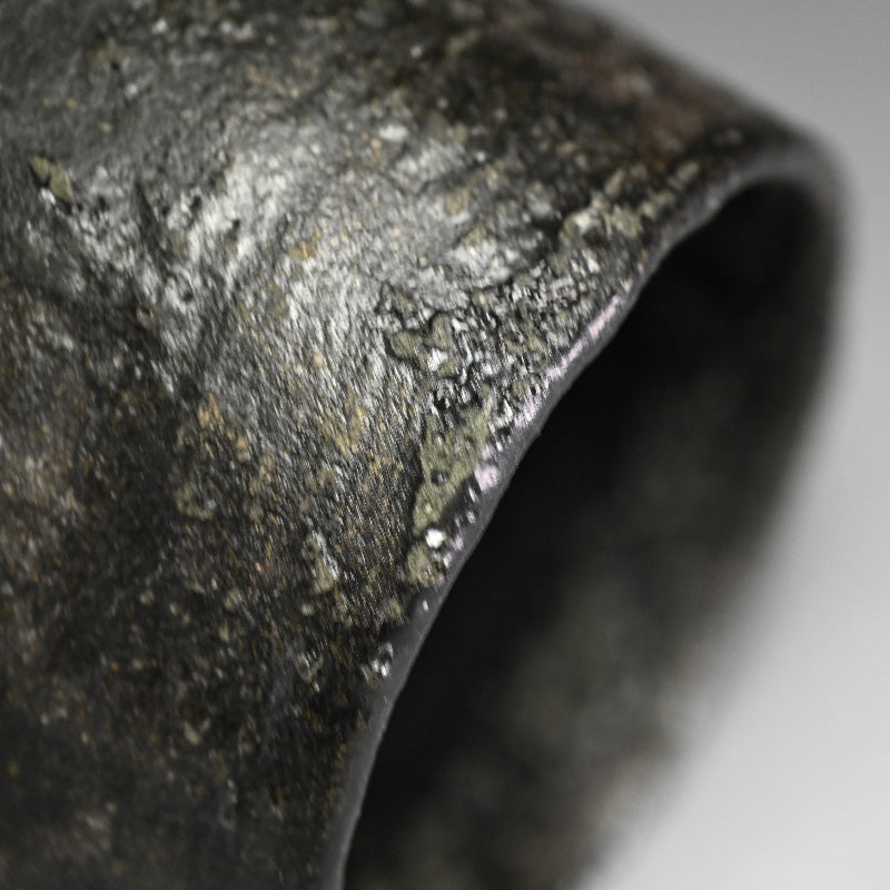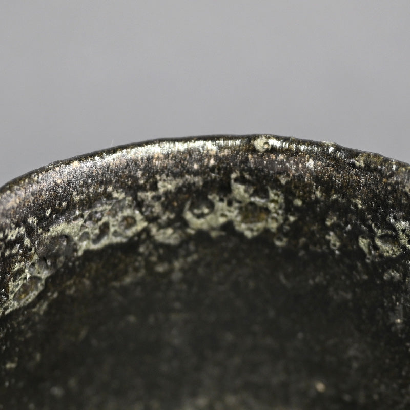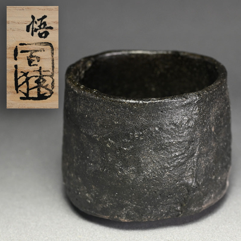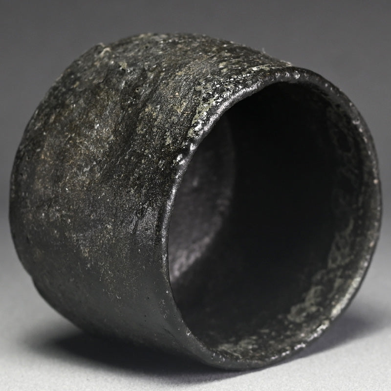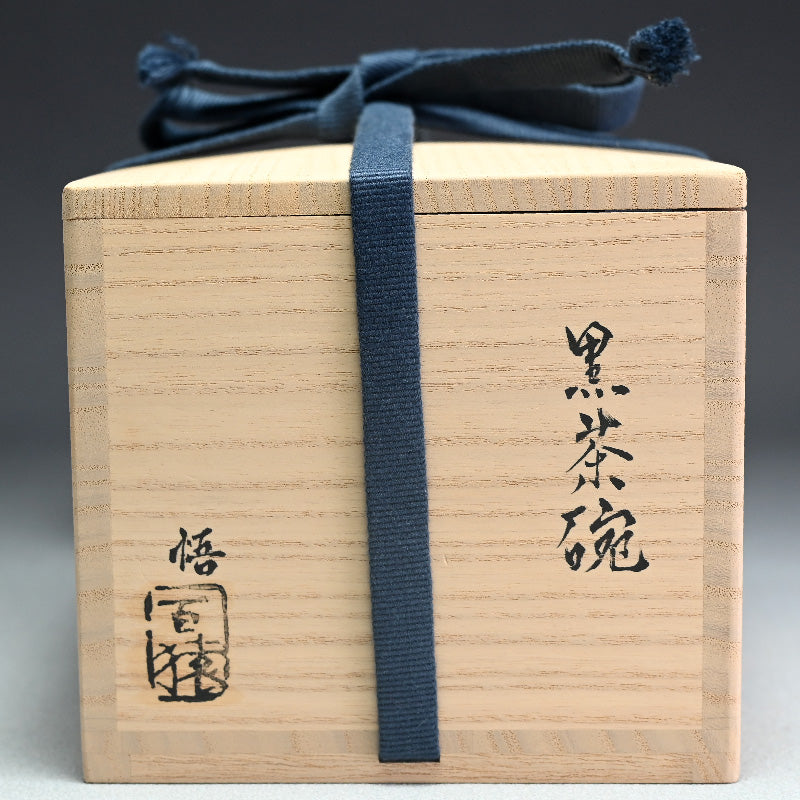 A fabulous, slightly closed bowl perfect for winter tea in igneous black glaze by Ohmae Satoru enclosed in the original signed wooden box titled Kuro Chawan. It is 11,5 cm (4-1/2 inches) diameter, 9 cm (3-1/2 inches) tall and in perfect condition, directly from the artist this summer.