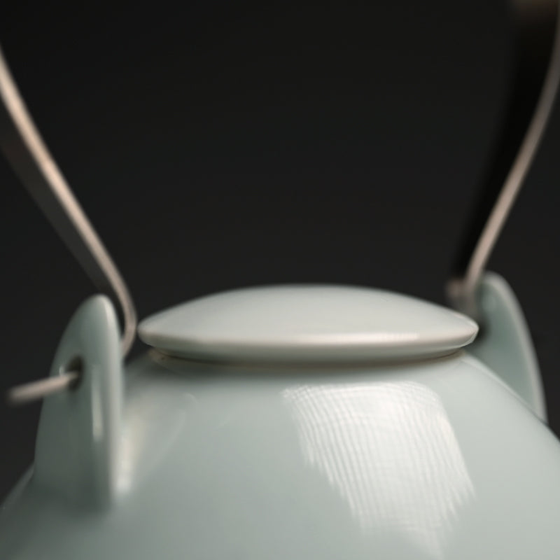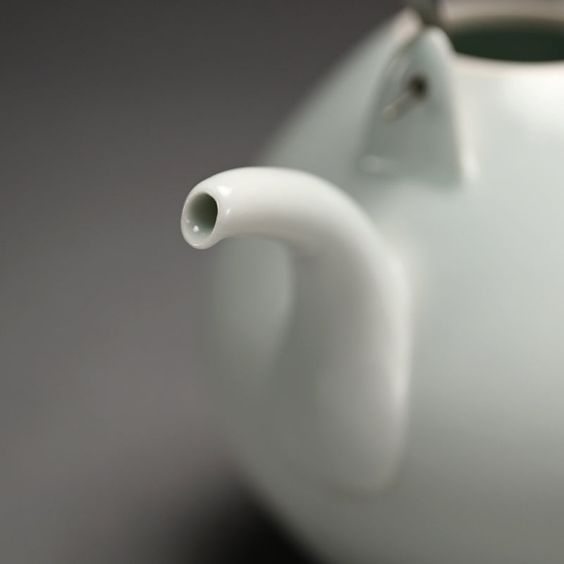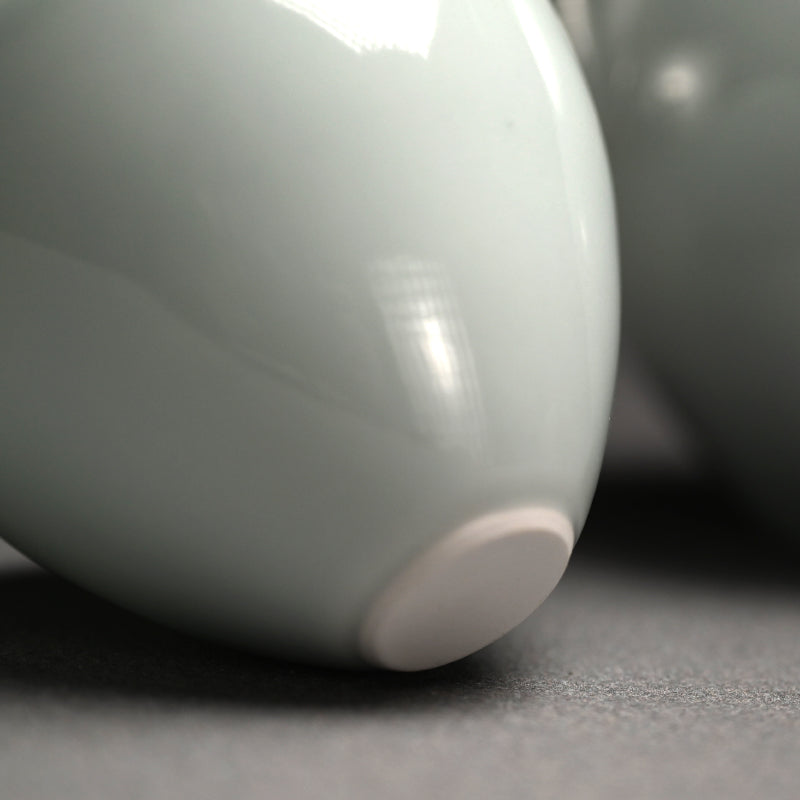 A serene boxed sencha tea set in sudued celadon glaze by perfectionist Usami Kensuke enclosed in the original signed and compartmentalized wooden box. It consists of five cups with a teapot and lid. Each cup is 8 cm (just over 3 inches) diameter, 5.5 cm (just over 2 inches) tall. The tea pot is 10 cm (4 inches) diameter, 19 cm (7-1/2 inches) tall and all are in perfect condition, directly from the artist this summer.