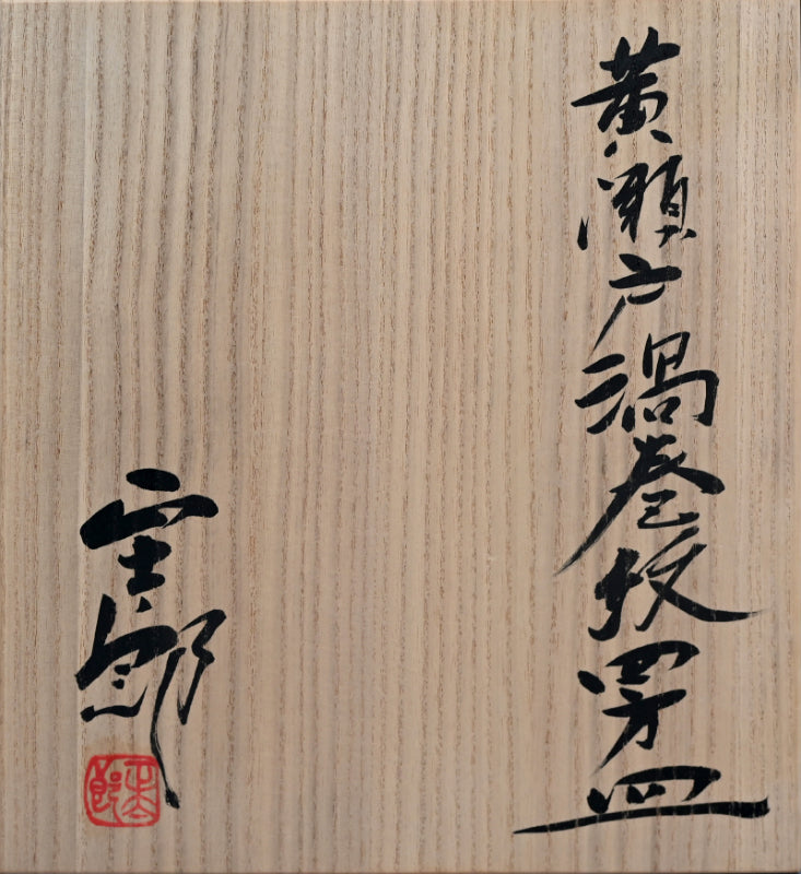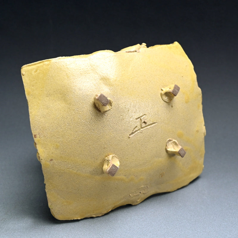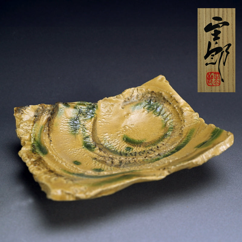 Copper green tinges the mustard surface of this striking elevated dish by Hayashi Shotaro enclosed in the original signed wooden box titled Ki-Seto Uzumaki-mon Shihozara (Swirling pattern Square Plate in Yellow Seto Glaze). It is 27 x 22 x 7.5 cm (10-3/4 x 9 x 3 inches) and is in excellent condition.
