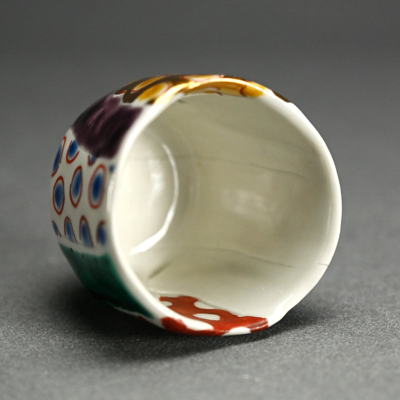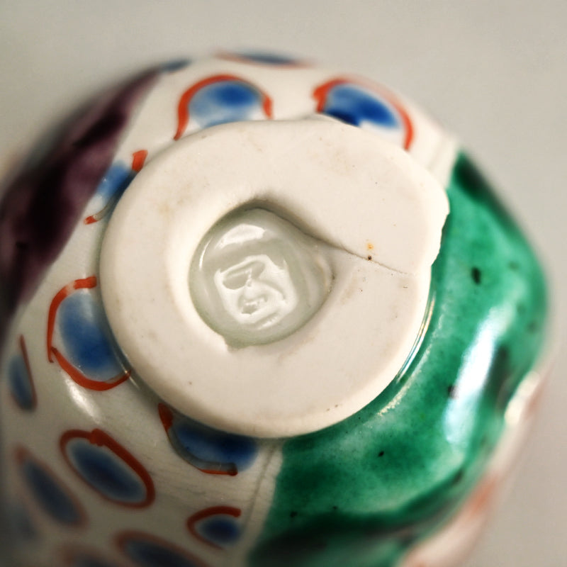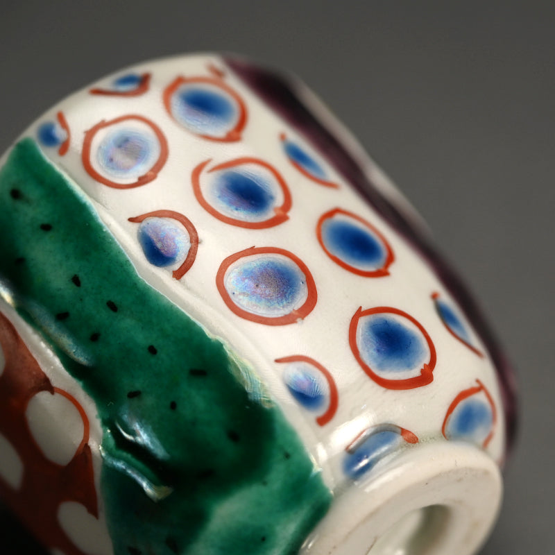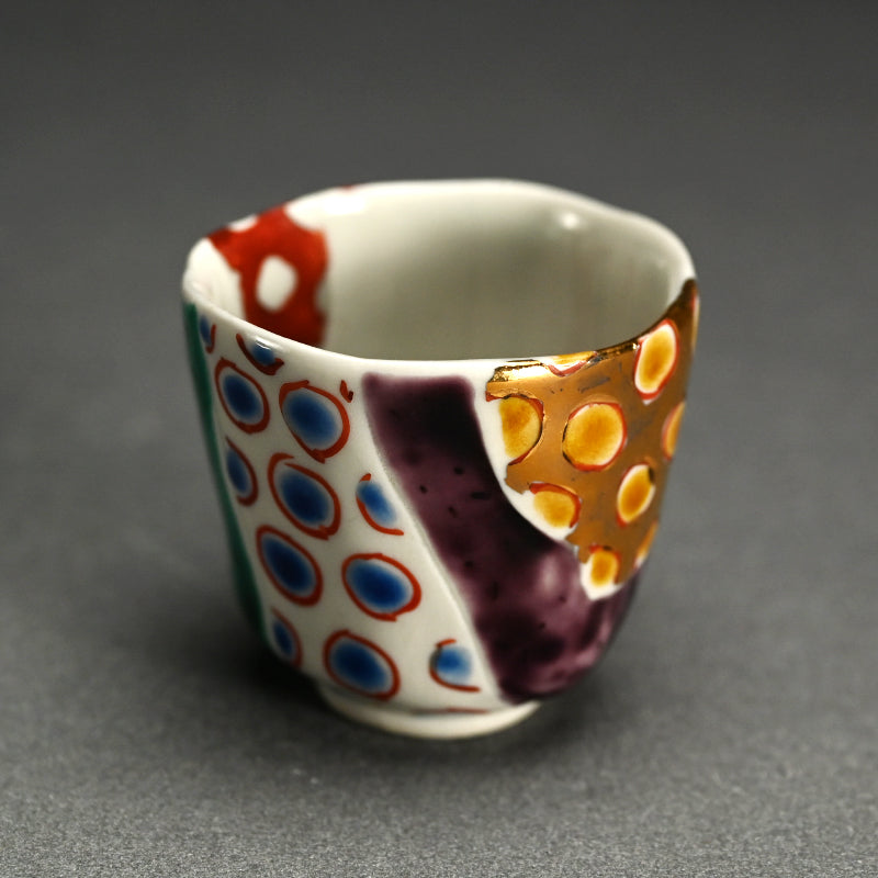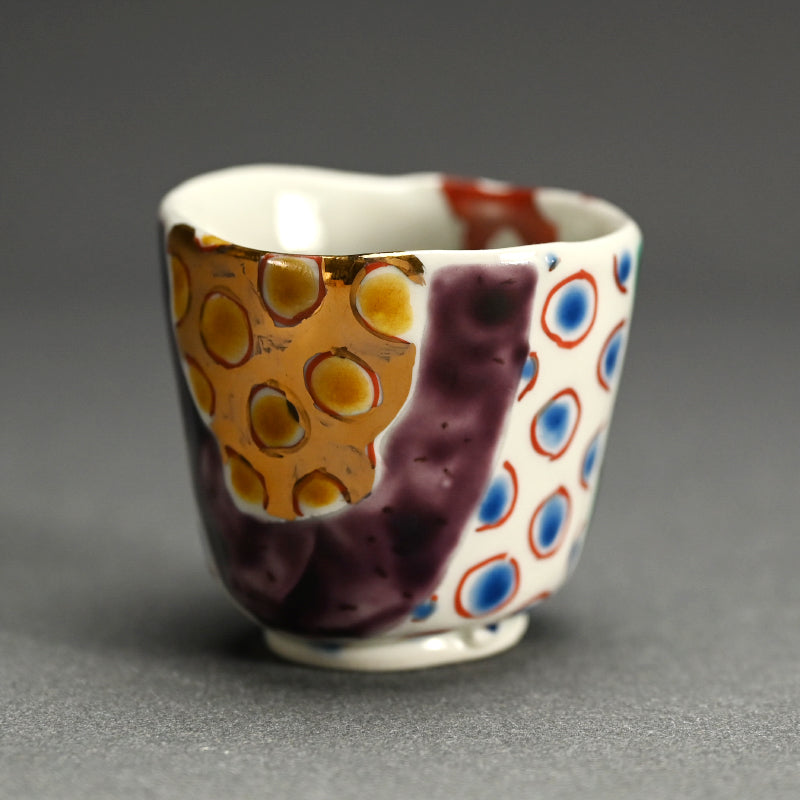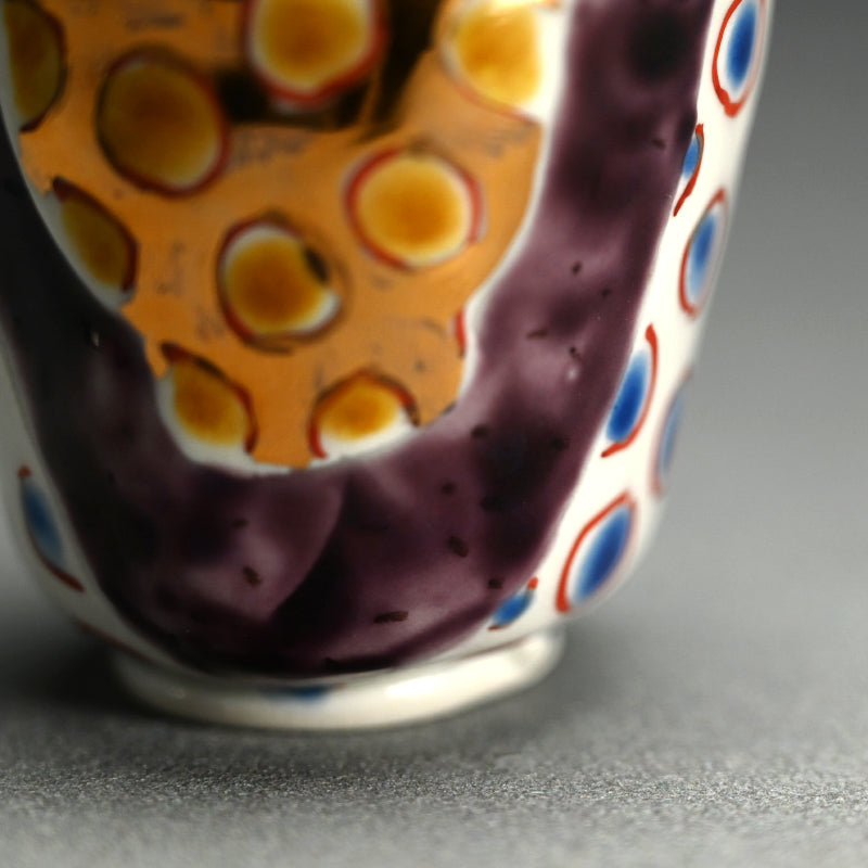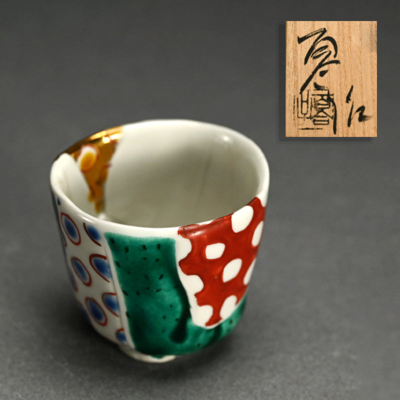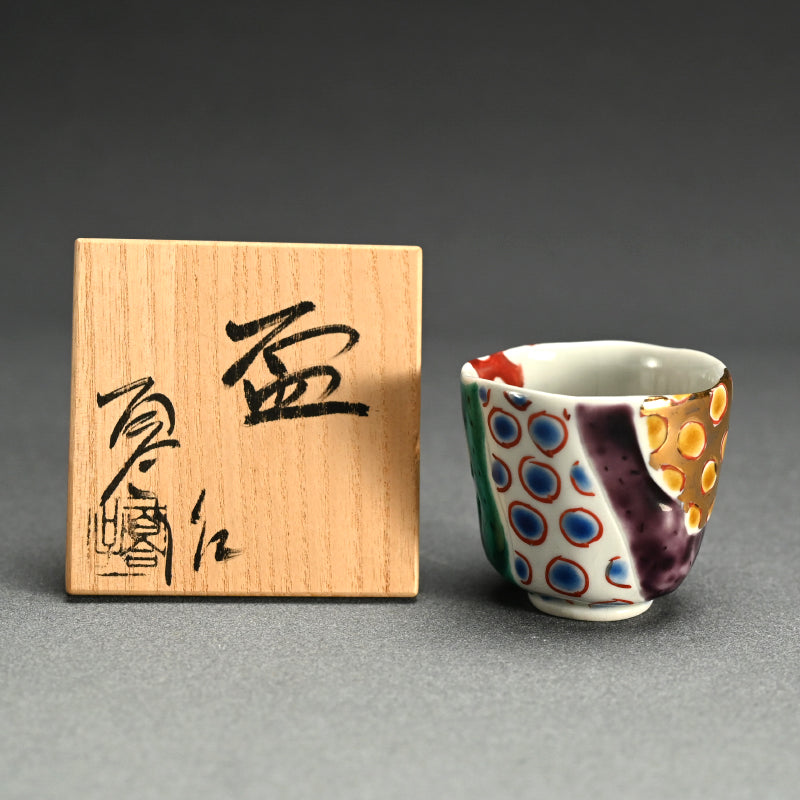 Playful designs in vibrant color decorate this sake cup by ground-breaking female artist Matsuda Yuriko enclosed in the original signed wooden box titled simply Hai. It is 6 cm (2-1/4 inches) diameter, 6 cm tall and in perfect condition.