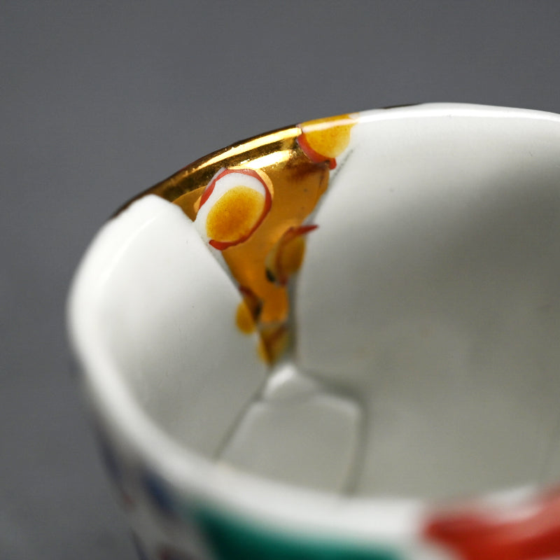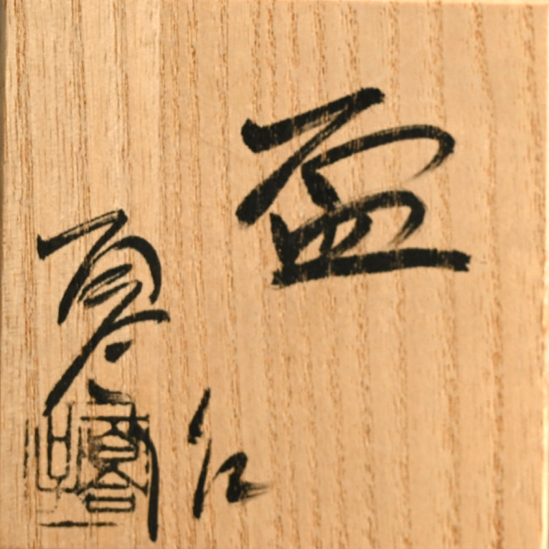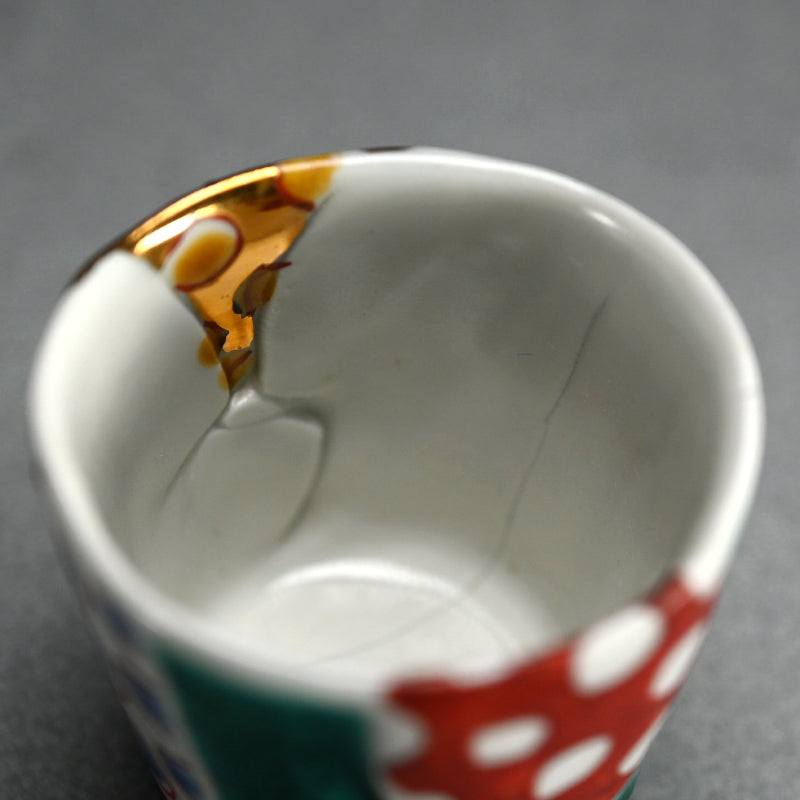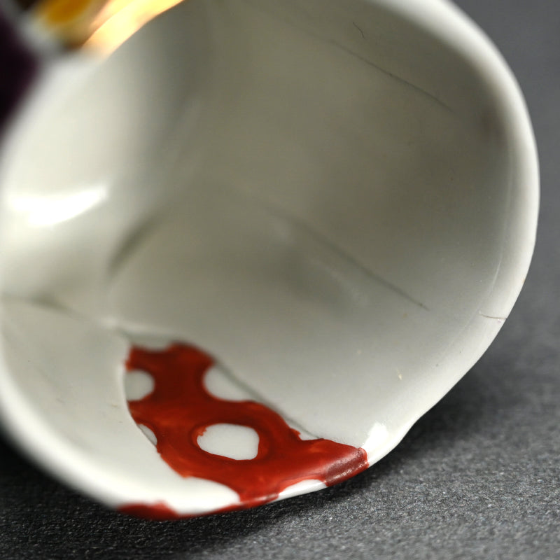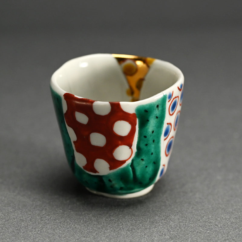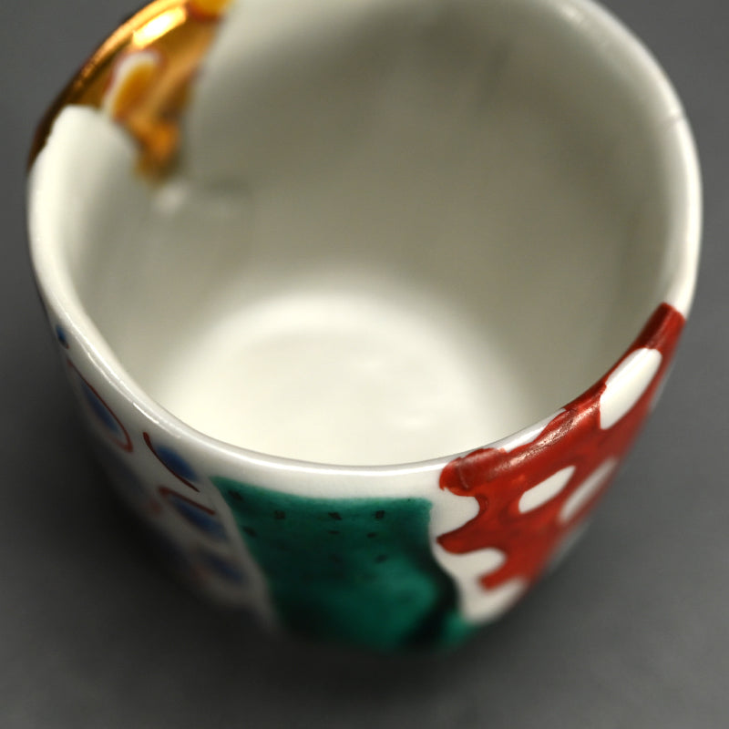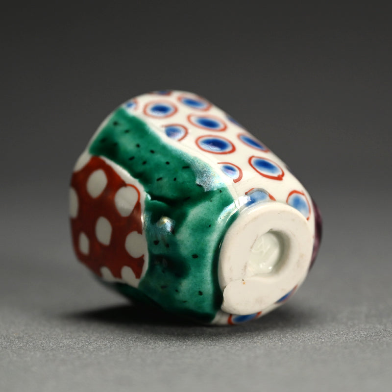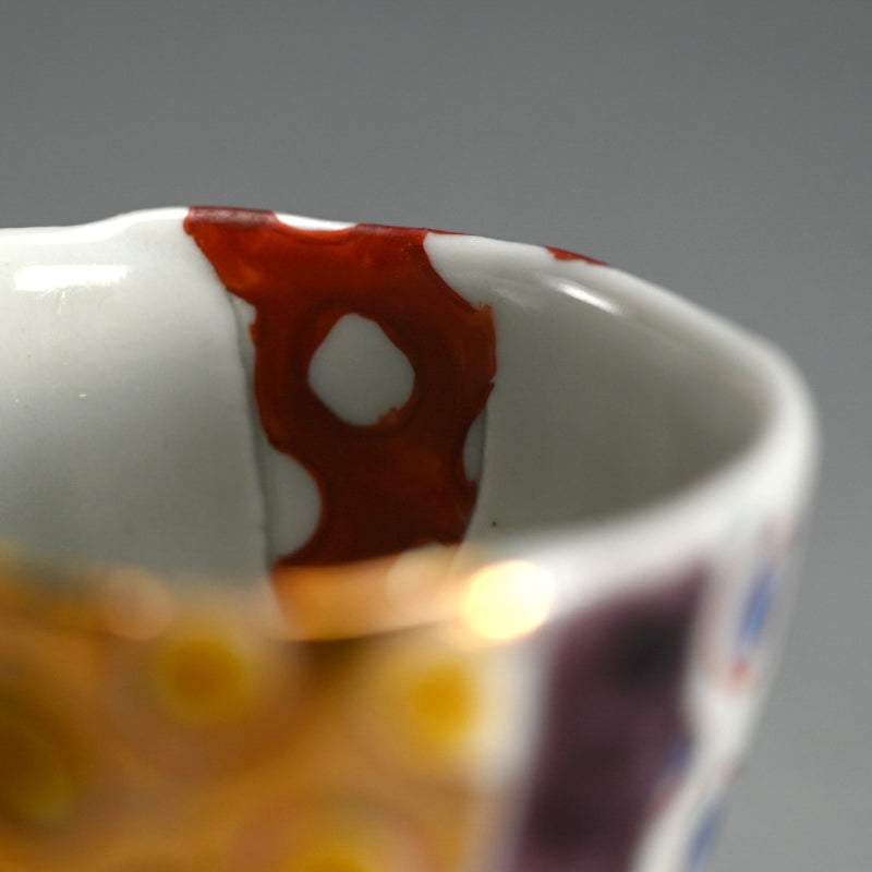 Playful designs in vibrant color decorate this sake cup by ground-breaking female artist Matsuda Yuriko enclosed in the original signed wooden box titled simply Hai. It is 6 cm (2-1/4 inches) diameter, 6 cm tall and in perfect condition.