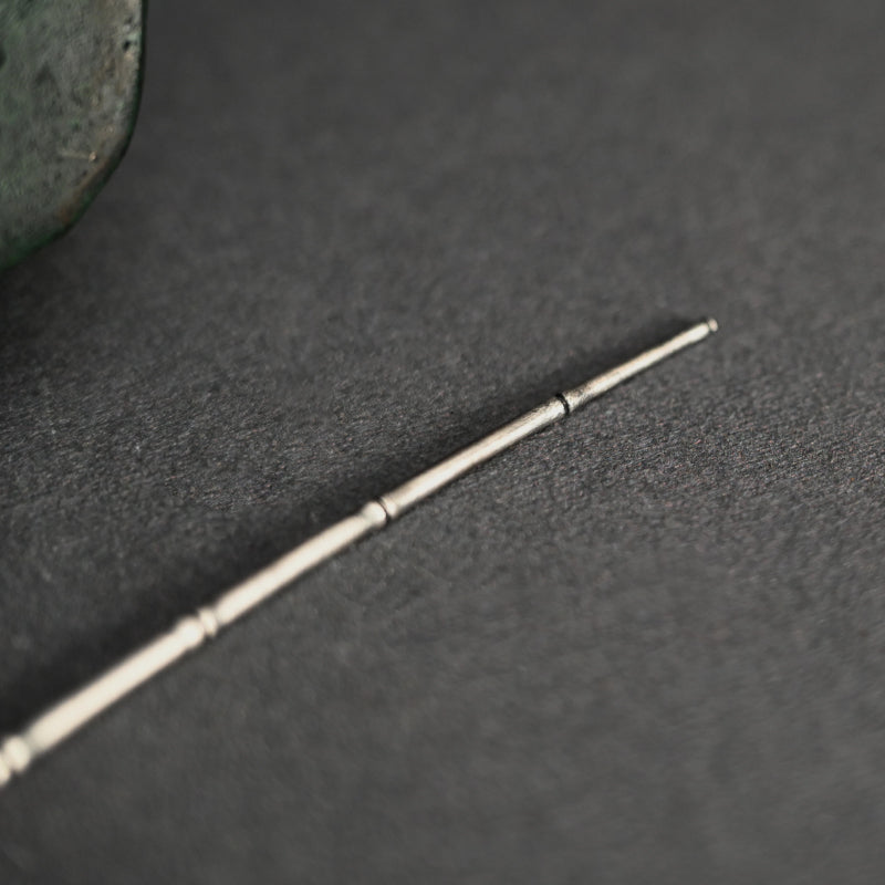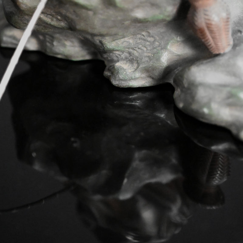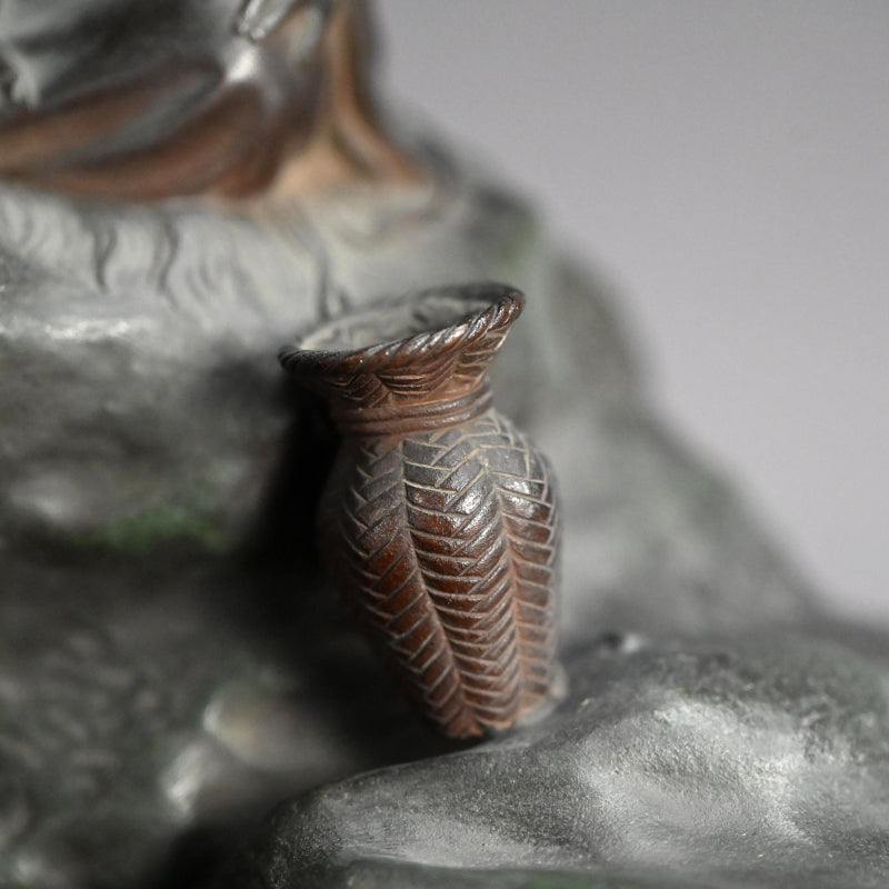 An exquisite rendering of the Chinese hero Taikobo (Ch. Jiang Ziya and Lü Shang) fishing upon a boulder along the river’s edge by Seimei dating from the early years of the 20th century enclosed in the original wooden box titled Sei-Do Sei, Iwa Ni Taikobo Okimono. The figure rests with a solid silver fishing rod under his legs dangling over the rocks edge, the entire on a disk of black lacquered wood. The bronze okimono is 23 x 13.5 x 15 cm (9 x 5-1/2 x 6 inches) excluding the fishing rod. It is signed on the back Seimei-koku.