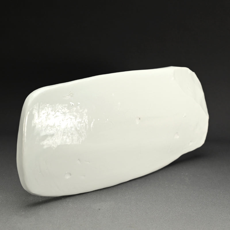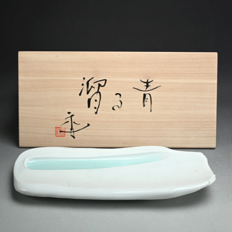A long slab dish with a slot for a knife by Kato Tsubusa enclosed in the original signed wooden box titled Pochon Chozara. This dish was exhibited at his first solo exhibition in the early 1980s. It is 46 x 2 x 5.5 cm (18 x 8 x 2 inches) and is in perfect condition, directly from the artist this summer.