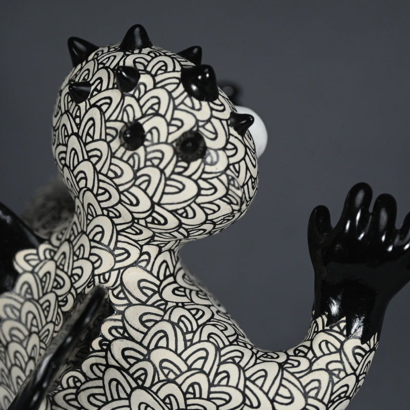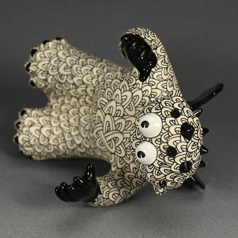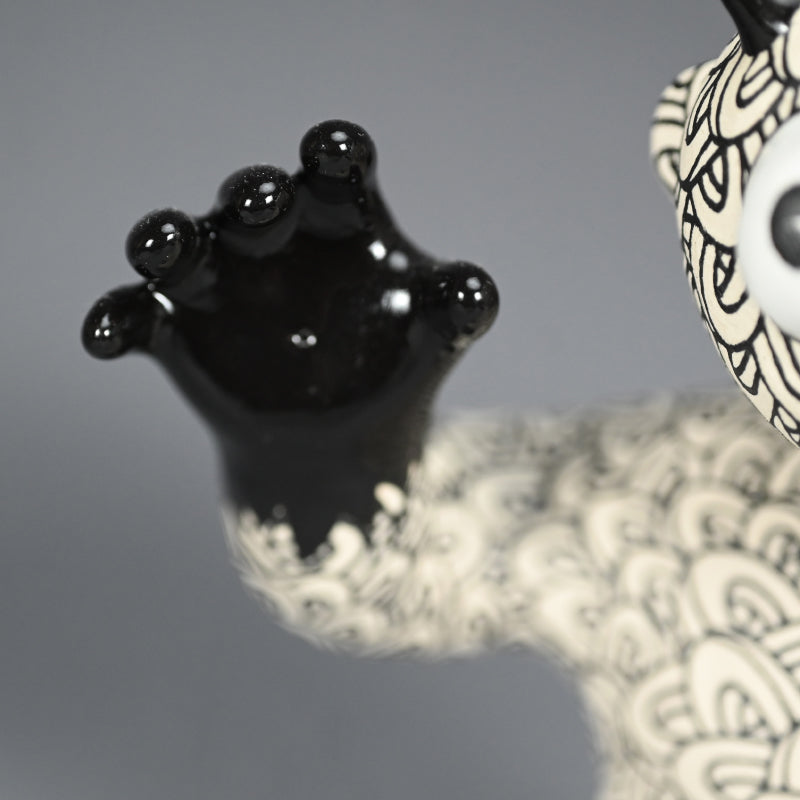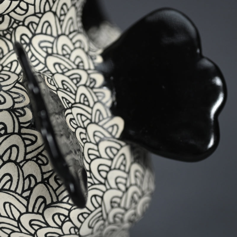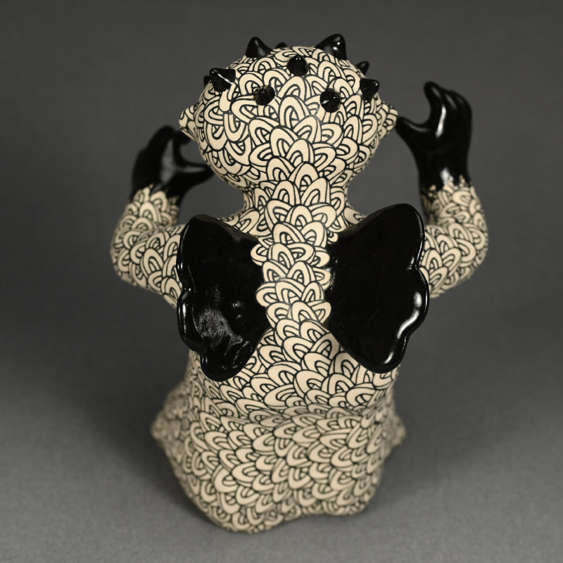 A ceramic figurine intricately decorated by Suzuki Yusaku enclosed in the original signed wooden box titled Uwasa no Ii Hito (The Rumored Good Person). Yusaku begins decorating with the heart, each line expanding out in a centrifugal growth from the last until the entire is covered. Even the box is a work of art. It is 15.5 x 14.5 x 19.5 cm (6 x 5-3/4 x 8 inches) and is in perfect condition.