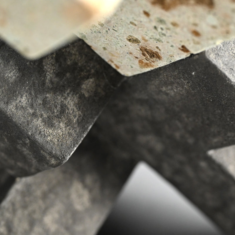 What a tour de force of design, a complex geometric tetrapod of black clay combined with Oya-stone by Takeuchi Kouzo enclosed in the original signed wooden box titled Hakubyaku (White and Black). It is 31 x 24.5 x 39 cm (12-1/2 x 10 x 15 inches) and is in excellent condition. The Beginnings of Integration with Different Materials: The idea for this series began because people often mistook my works for paper. By incorporating different materials, the contrast became more pronounced, and I thought it would draw more focus on the white porcelain. I use stone, iron, wood, and glass as dissonant materials.
