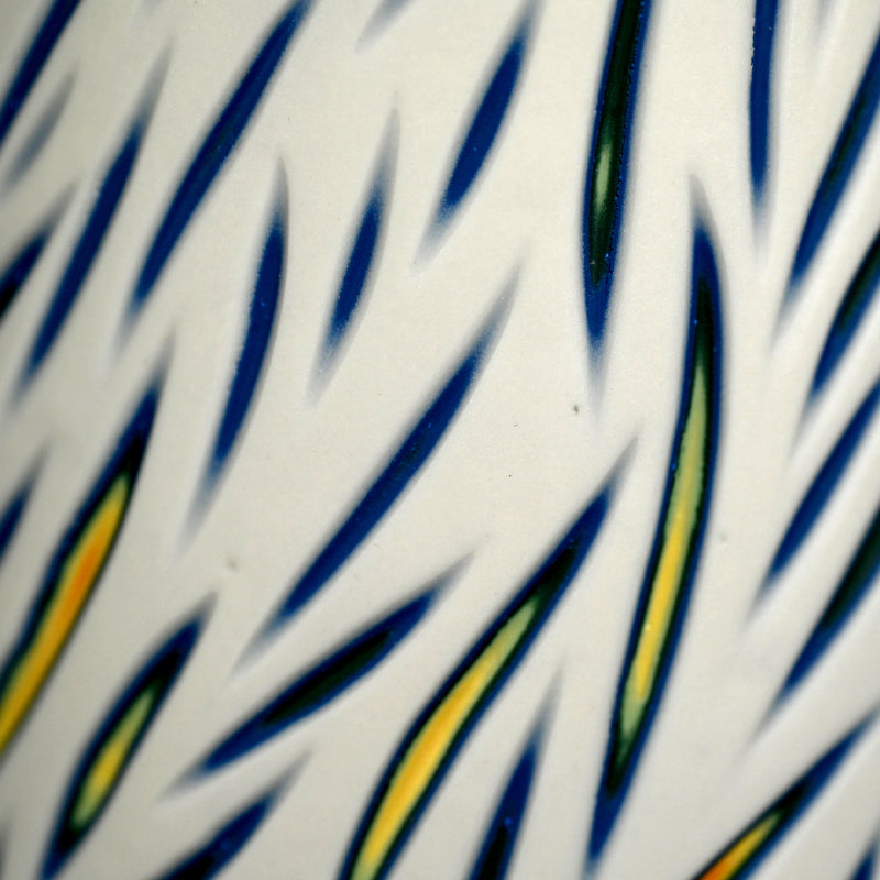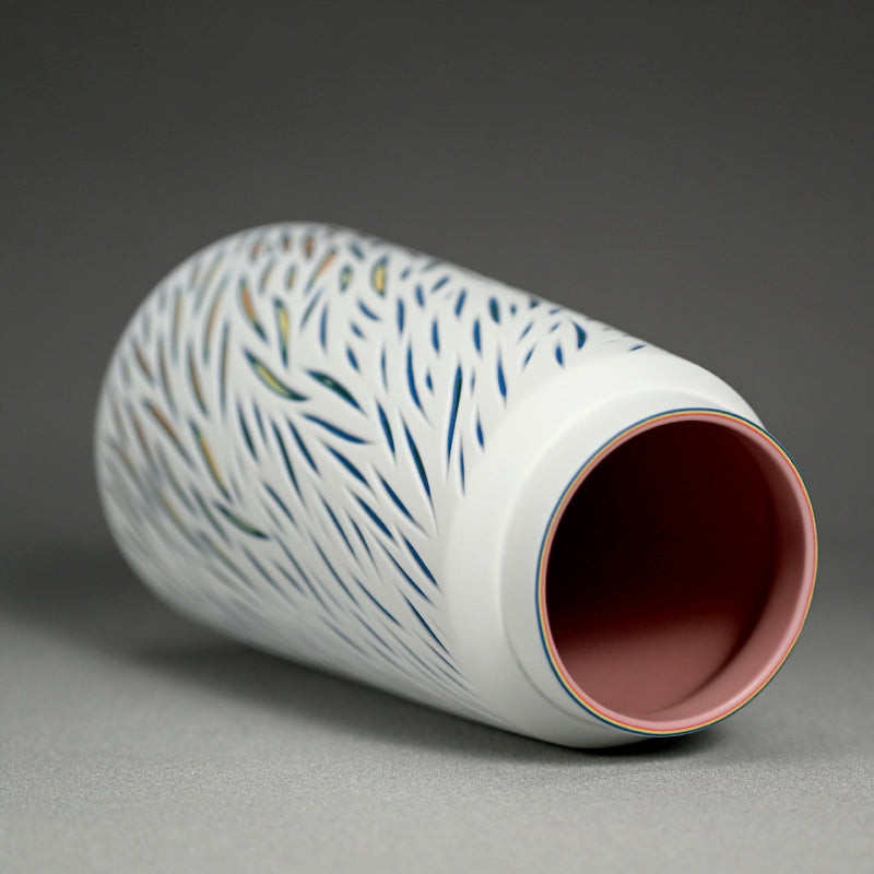 A vase of layered colored porcelain which has been ground through with a grass pattern revealing the layers of color hidden beneath the white porcelain by Kitagawa Kazuki enclosed in the original signed wooden box titled Kasane-iro-me Kaki. It is 11 cm (4-1/4 inches) diameter, 19.5 cm (just under 8 inches) tall and in excellent condition, directly from the artist.