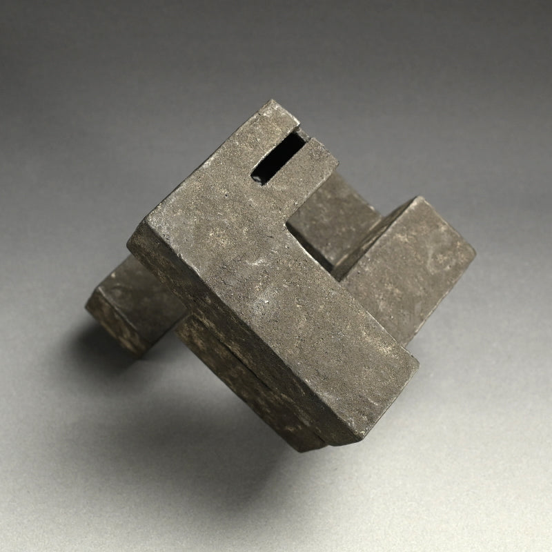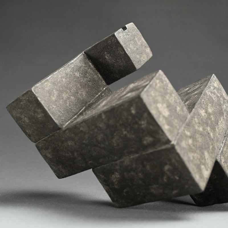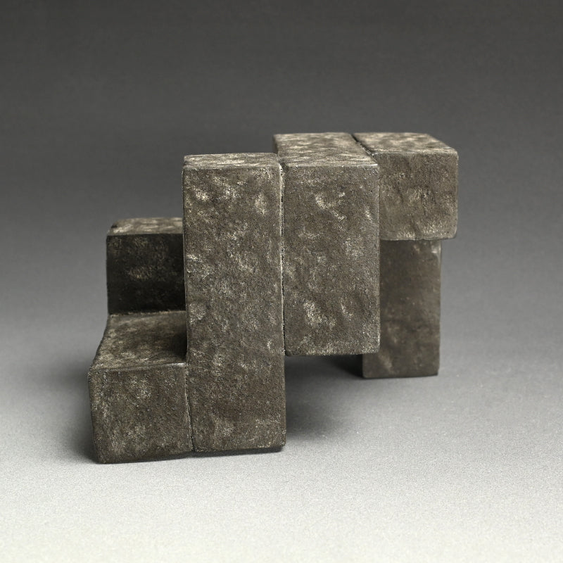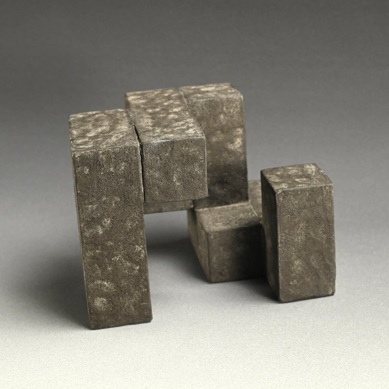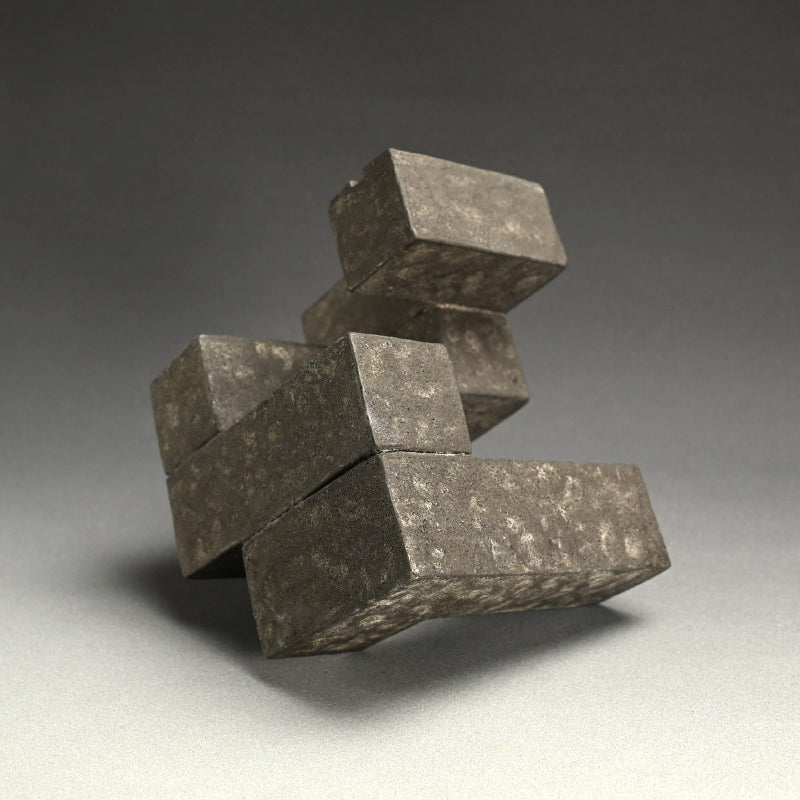 A black clay object of stacked blocks writhing like a snake by Takeuchi Kozo enclosed in the original signed wooden box titled Genseki Tan (Modern Ruins). It is 33 x 26 x 24 cm (13 x 10 x 9-3/4 inches) and is in perfect condition, directly from the artist. Through tatara molding, I draw inspiration from the grandeur and majestic presence of the Mayan ruins in Mexico, which I visited during my student days. This series resonates with the atmosphere of traditional Japanese houses, aiming to infuse overwhelming strength into my works.