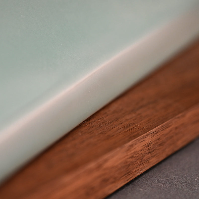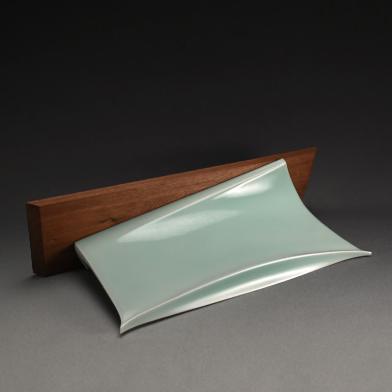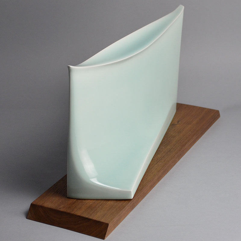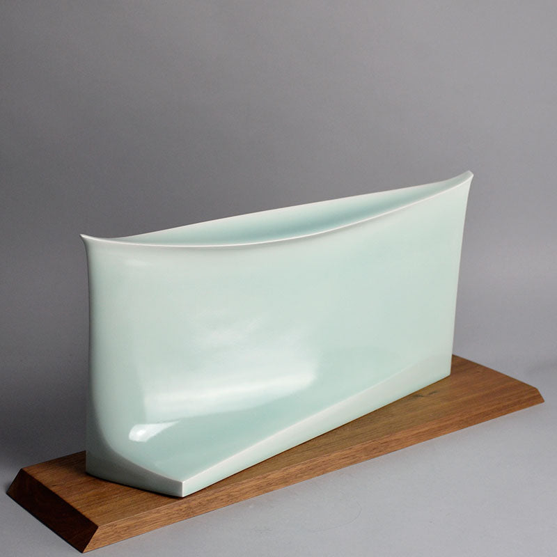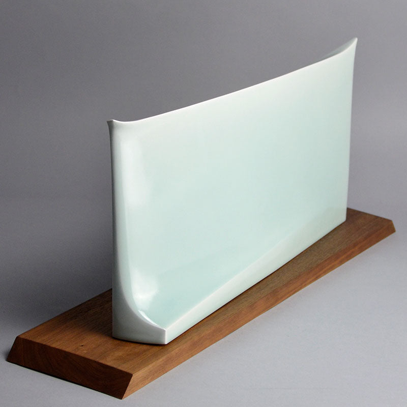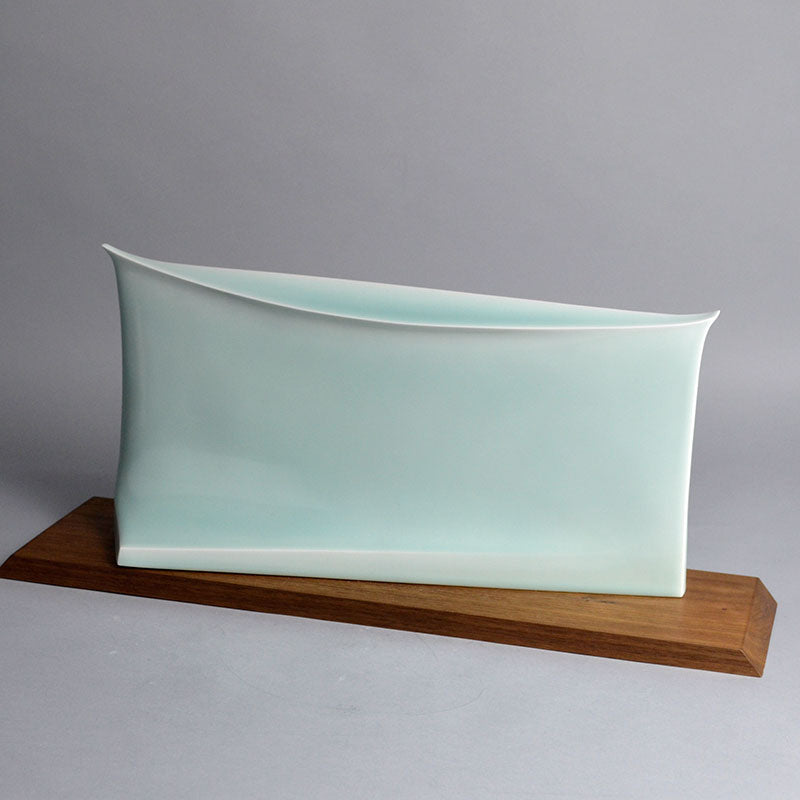 A wall of hope mounted on a wooden base by seihakuji legend Fukami Sueharu titled Renbo-no Kei in pure celadon green, a quintessential piece by this artist. The sculpture itself is 43.5 cm (17 inches excluding the base) long and in excellent condition.