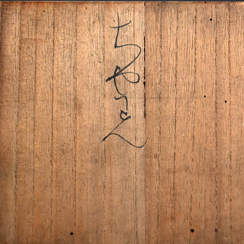 A poem wraps the finger dimpled surface of this pale glazed hira-chawan decorated with a poem enclosed in a rare signed wooden box by Otagaki Rengetsu. It is 13.5 cm (5-1/2 inches) diameter, 5.2 cm (2 inches) tall. There is single gold lacquer line extending from the rim. The poem reads: