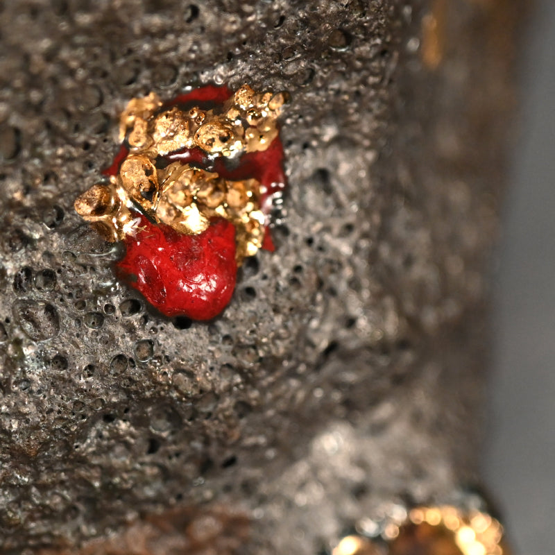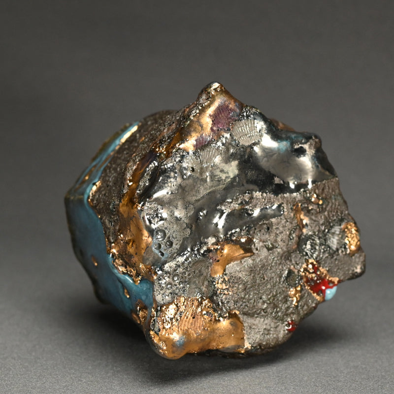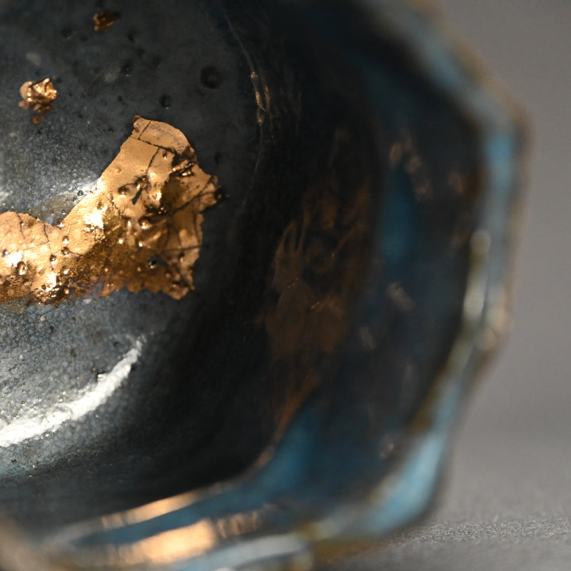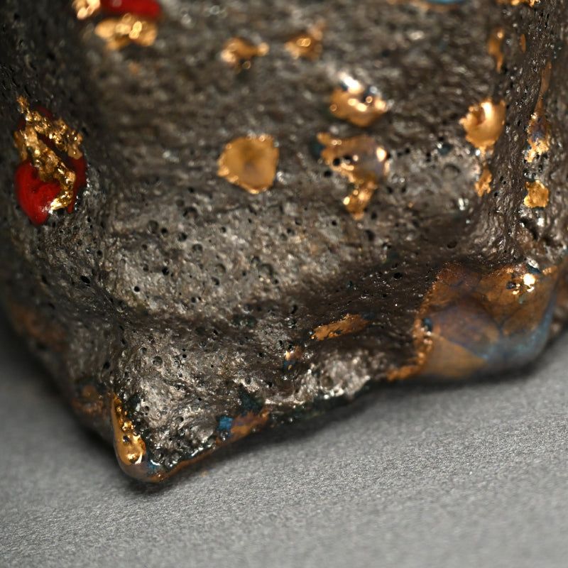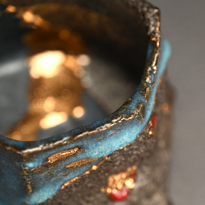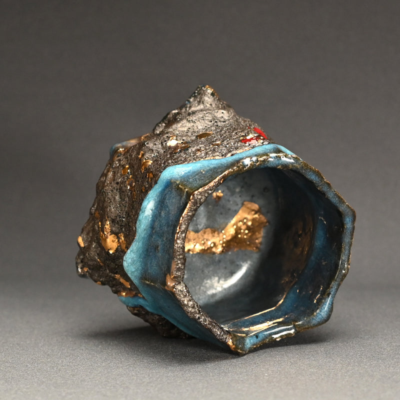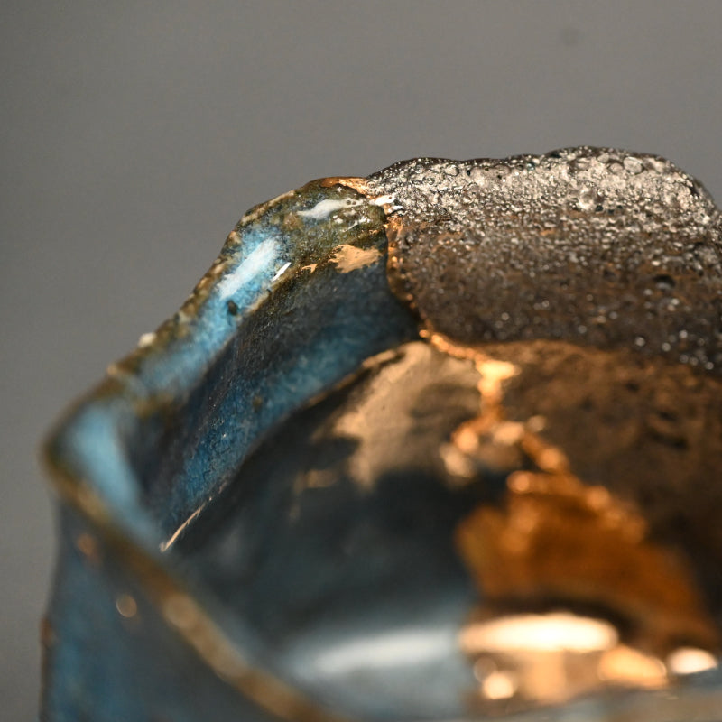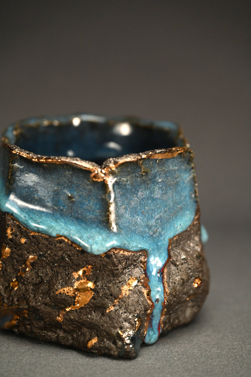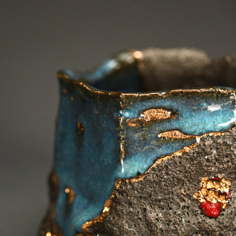 A magnificent bowl in dark earth through which run veins of gold with blue glaze draped over the side and accents in red by Ichikawa Toru enclosed in the original signed wooden box. It is 12 x 13 x 9.5 cm (roughly 5 inches diameter, 4 inches tall) and in excellent condition.