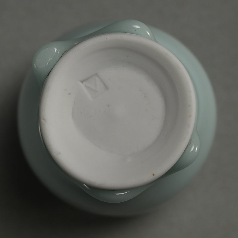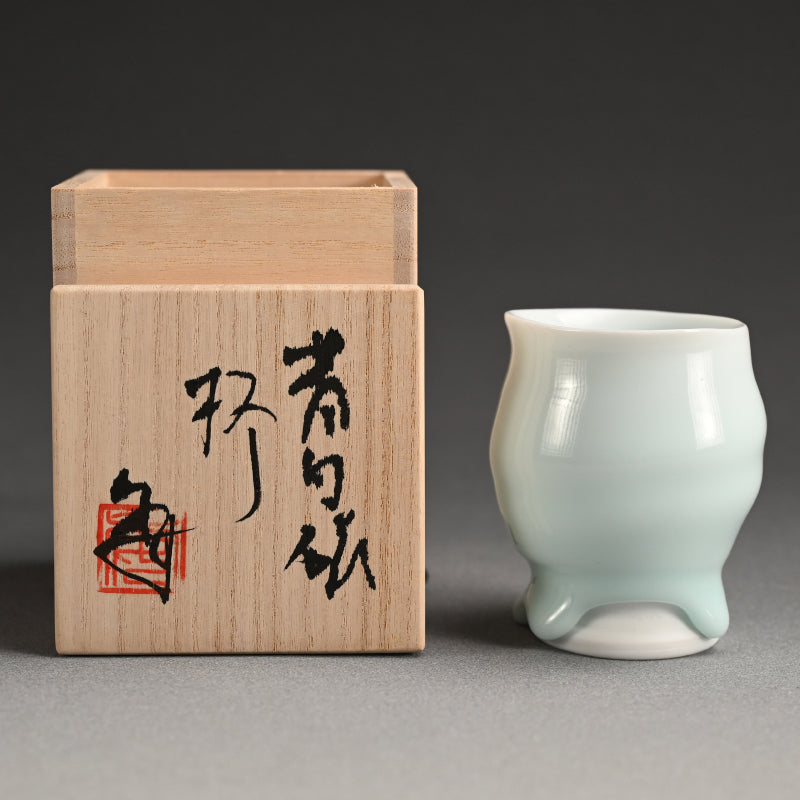 Rich pale-blue-green celadon glaze forms thick droplets around the foot of this beautiful tea cup by Kato Tsubusa enclosed in the original signed wooden box. It is 8 cm (just over 3 inches) diameter, 9.5 cm (just under 4 inches) tall and in perfect condition, directly from the artist this summer.