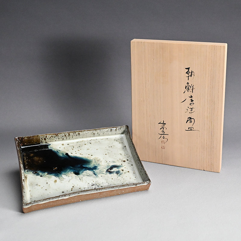 A gorgeous platter by Maruta Munehiko enclosed in the original signed wooden box titled Chossen Karatsu Kakuzara. It is 31.5 x 21 x 4 cm (12-1/2 x 8-1/4 x 1-1/2 inches) and is in perfect condition.