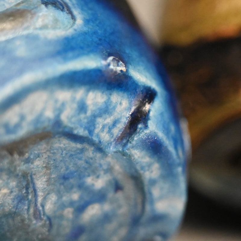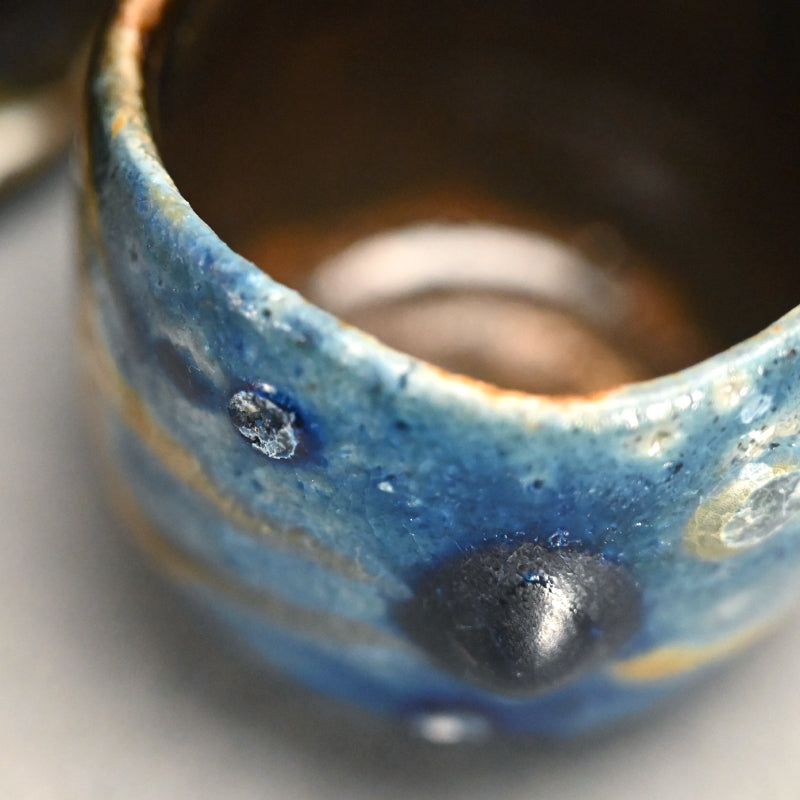 A Tokkuri paired with a set of two Guinomi by Baba Takashi enclosed in the original signed wooden box titled Yohen-Ao Shuki Zen. The origin of the Ao-yohen (blue kiln transformation) began by chance when a small sake cup (guinomi) accidentally tumbled into the embers, revealing a serendipitous blue kiln change. “Focusing on this blue, I conducted research, refining the clay, kiln loading, and firing process to bring out the blue color. After 12 years, I finally achieved a vibrant hue”. Although he fires twice a year, producing about 1,000 pieces each time, only a fraction exhibit the blue kiln transformation. The Tokkuri is 8 cm (3-1/4 inches) diameter, 14 cm (5-1/2 inches) tall. The Guinomi are 7 cm (just less than 3 inches) diameter, 6 cm (2-1/2 inches) tall, and all are in excellent condition, directly from the artist.