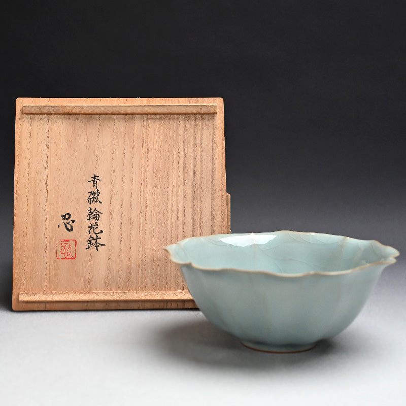 A beautiful blue fluted bowl by Kawase Shinobu enclosed in the original signed wooden box titled Seiji Rinka Bachi. It is 19.5 cm (8 inches) diameter, 8 cm (3 inches) tall to the rim and in excellent condition.