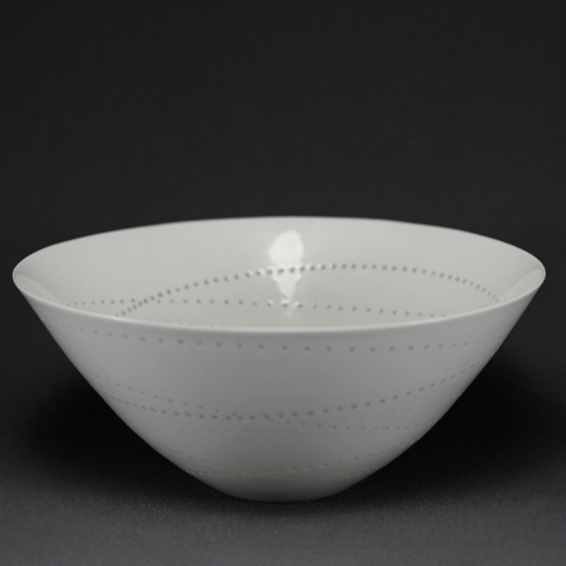 An exquisite open basin by Niisato Akio enclosed in the original signed wooden box titled Hikari Utsuwa (Vessel of Light). The porcelain body is pierced with spiraling forma allowing light to pass through. It is 23 cm (9 inches) diameter, 9.5 cm (4 inches) tall and in excellent condition.
