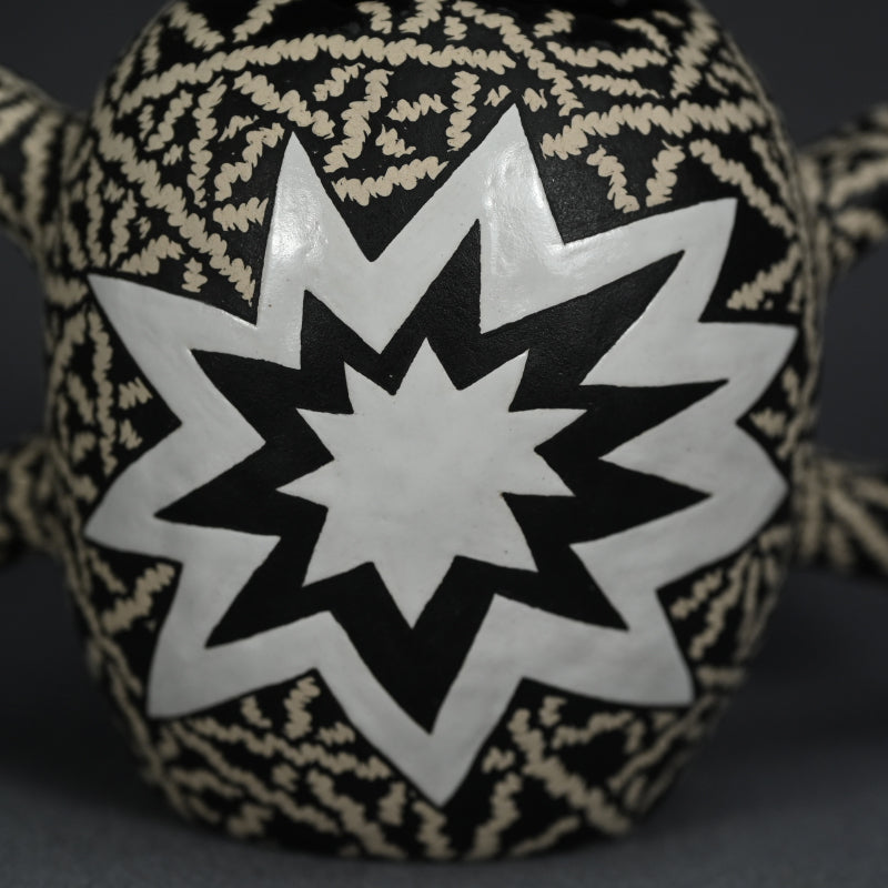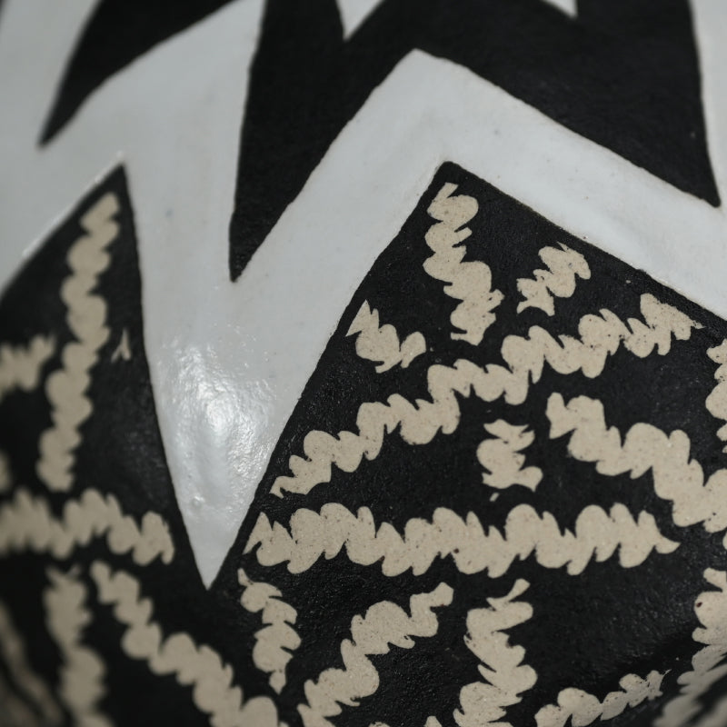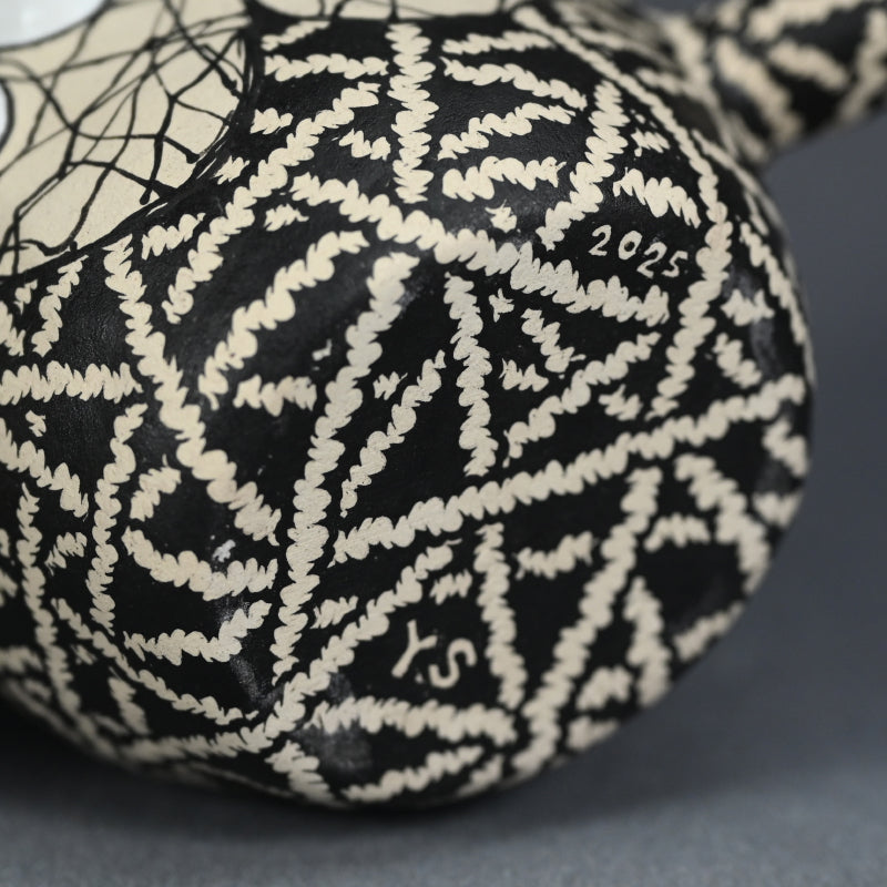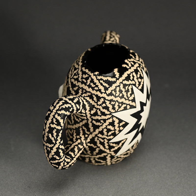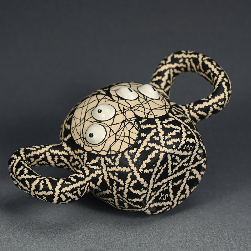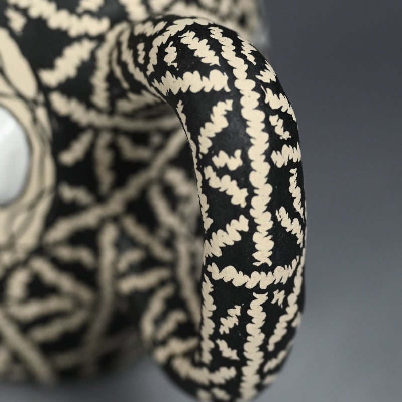 A playful work with looping handles decorated with intricate patterns by Suzuki Yusaku enclosed in the original signed wooden box titled Dochi ga Dochi (Which is Which?). Two elongated faces with bulging eyes look warily in both directions. The tangled pattern layed over black is serpentine, ominous as well as striking in its directness. It is 21 x 10.5 x 11.5 cm (8-1/4 x 4-1/4 x 4-1/2 inches) and is in excellent condition, directly from the artist created this year.