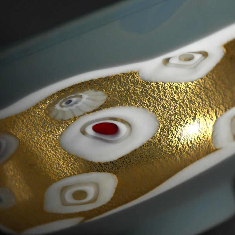 An elegant bowl in Picasso grey with a belt of jewels floating in a river of gold by pioneering glass artist Ishii Koji enclosed in the original signed wooden box titled Tefuki Garassu Chawan, It is 12 cm (5 inches) diameter, 8 cm (3 inches) tall and in excellent condition.