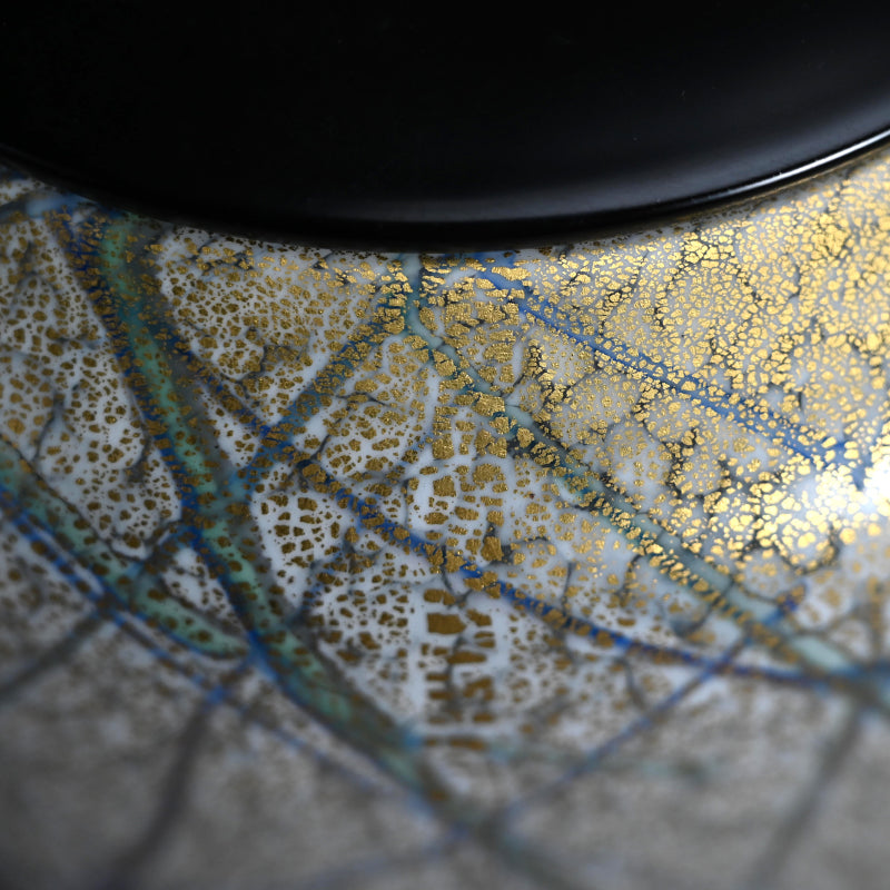 Deep within an abstract forest misted with gold fog, an exquisite Mizusashi water jar for use in the Japanese Maccha Tea Ceremony by pioneering glass artist Ishii Koji enclosed in the original signed wooden box titled Tefuki Garassu Mizusashi. With incised signature on the base, it retains the original black lacquered wooden lid. The result evokes shifting atmospheres—mist, river-light, or windborne threads drawn across water—an effect that feels both seasonal and poetic rather than pictorial. The imagery is not decorative but atmospheric: resonant with the tea aesthetic of suggestion over declaration. In the context of chanoyu, this mizusashi mediates between purity and reflection; its interior holds the cool clarity of water, while its exterior gathers the transient play of light, aligning Ishii’s glass artistry with the contemplative sensibility of the tearoom. The rounded form is softly weighted toward the base, creating a sense of quiet rootedness, while a smooth, matte lacquer-black lid offers a striking but dignified counterpoint to the shimmering body. It is 18 cm (7-1/4 inches) diameter, 19 cm (7-1/2 inches) tall and in excellent condition.