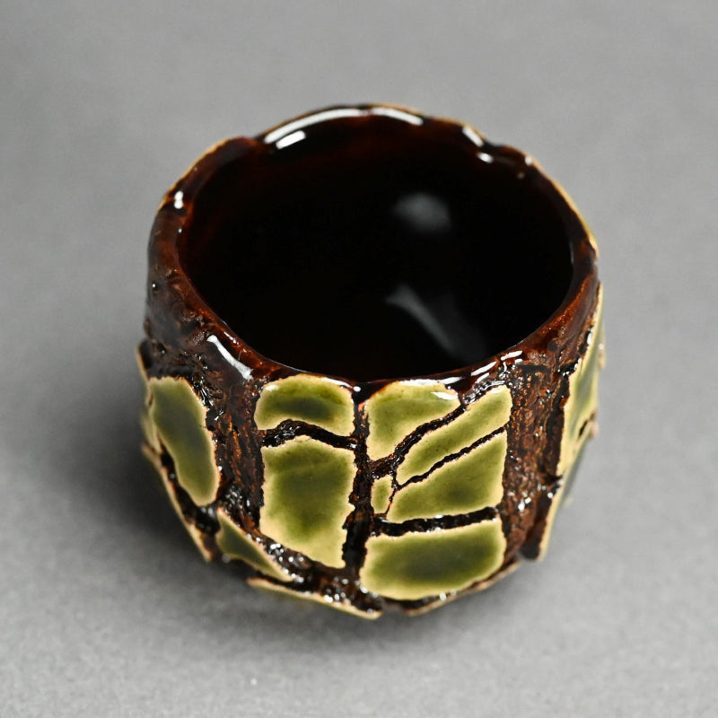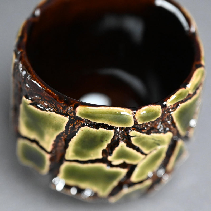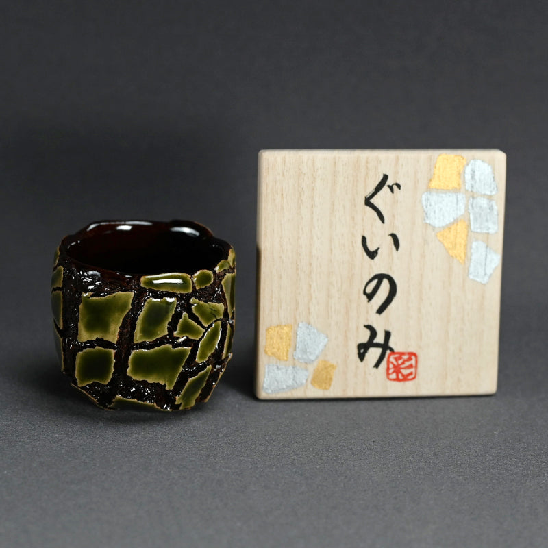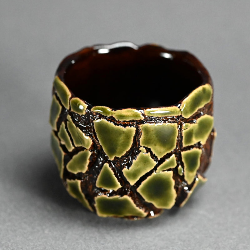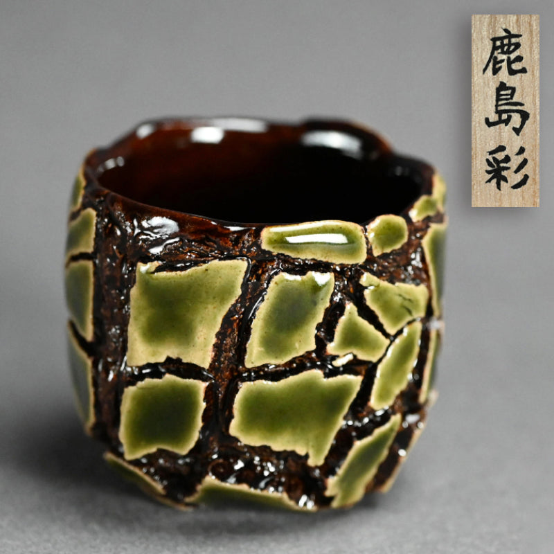 A guinomi sake cup by popular young female artist Kashima Aya in her newly developed green glaze enclosed in the original signed wooden box, The technique is deceptively complex. In fact, the initial form is created, then a thin layer of ceramic is made separately, dried, then cracked, and the individual pieces are applied like mosaic to the prepared form. The space in between the tiles is then abraded, the tiles glazed with color and the space n between glazed with iron. Each piece requires a great amount of painstaking dedication to complete. It is 7 cm (just less than 3 inches) diameter, 6 cm (2-1/2 inches) tall and in excellent condition, directly from the artist.